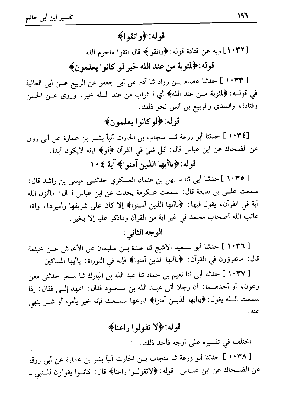 1038 - حَدَّثَنَا أَبُو زُرْعَةَ ثنا مِنْجَابُ بْنُ الْحَارِثِ أَنْبَأَ بِشْرُ بْنُ عُمَارَةَ عَنْ أَبِي رَوْقٍ عَنِ الضَّحَّاكِ عَنِ ابْنِ عَبَّاسٍ: قَوْلُهُ: لَا تَقُولُوا رَاعِنَا قَالَ: كَانُوا يَقُولُونَ لِلنَّبِيِّ-