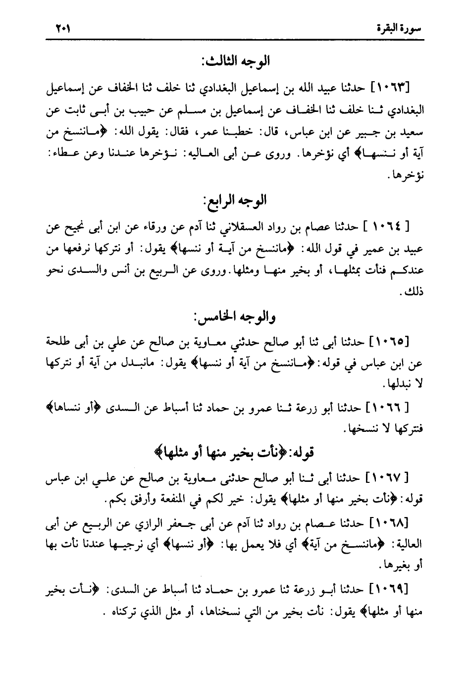 1069 - حَدَّثَنَا أَبُو زُرْعَةَ ثنا عَمْرُو بْنُ حَمَّادٍ ثنا أسباط عَنِ السُّدِّيِّ: نَأْتِ بِخَيْرٍ مِنْهَا أَوْ مِثْلِهَا يقول: نأت بخير من التي نسخناها، أَوْ مِثْلِ الَّذِي تَرَكْنَاهُ.