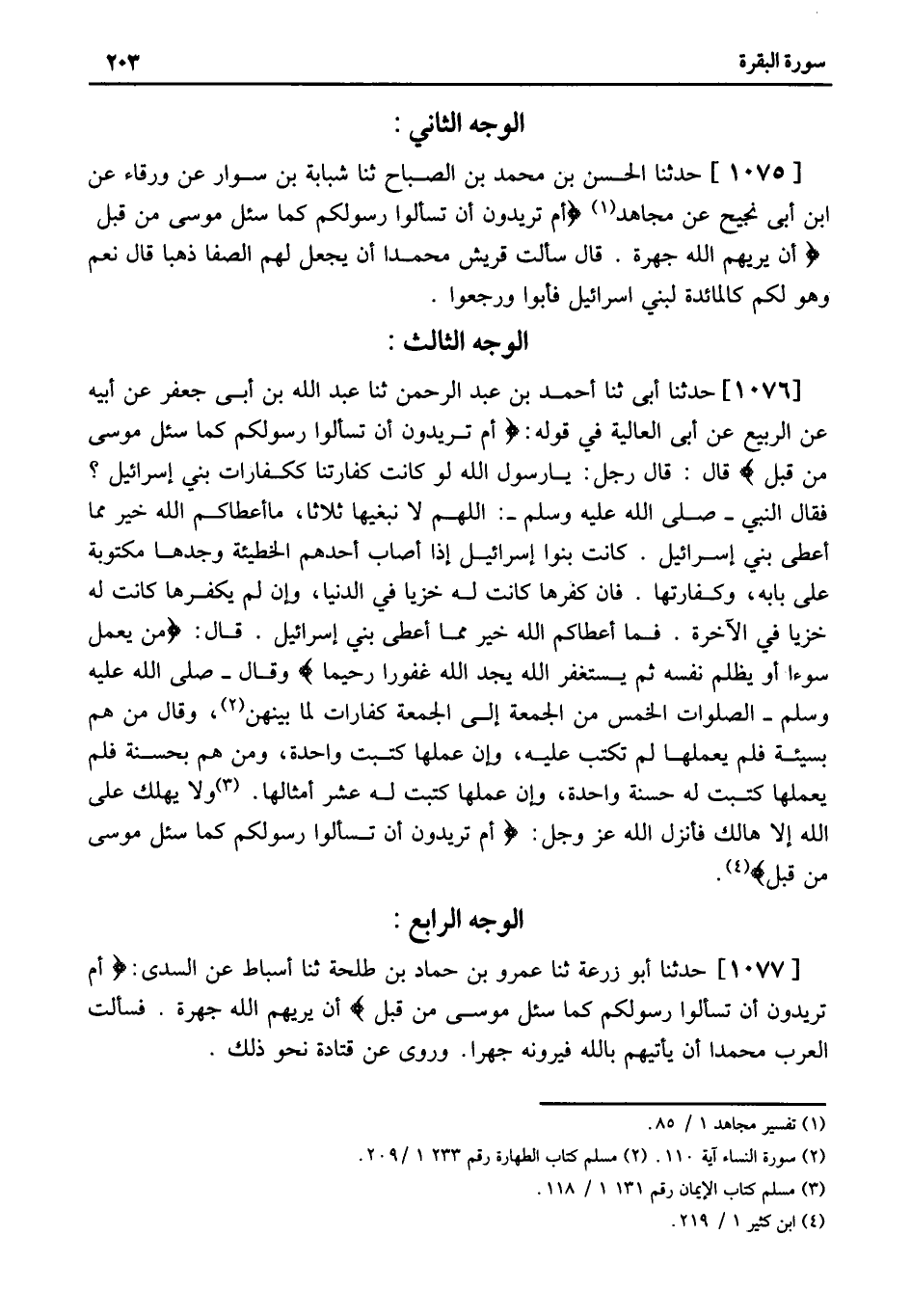 1077 - حَدَّثَنَا أَبُو زُرْعَةَ ثنا عَمْرُو بْنُ حَمَّادِ بْنِ طَلْحَةَ ثنا أَسْبَاطٌ عَنِ السُّدِّيِّ: أم تريدون أن تسئلوا رَسُولَكُمْ كَمَا سُئِلَ مُوسَى مِنْ قَبْلُ أَنْ يُرِيَهُمُ اللَّهَ جَهْرَةً. فَسَأَلْتِ الْعَرَبُ مُحَمَّدًا أَنْ يَأْتِيَهُمْ بِاللَّهِ فَيَرَوْنَهُ جَهْرًا. وَرُوِيَ عَنْ قَتَادَةَ نحو ذلك.