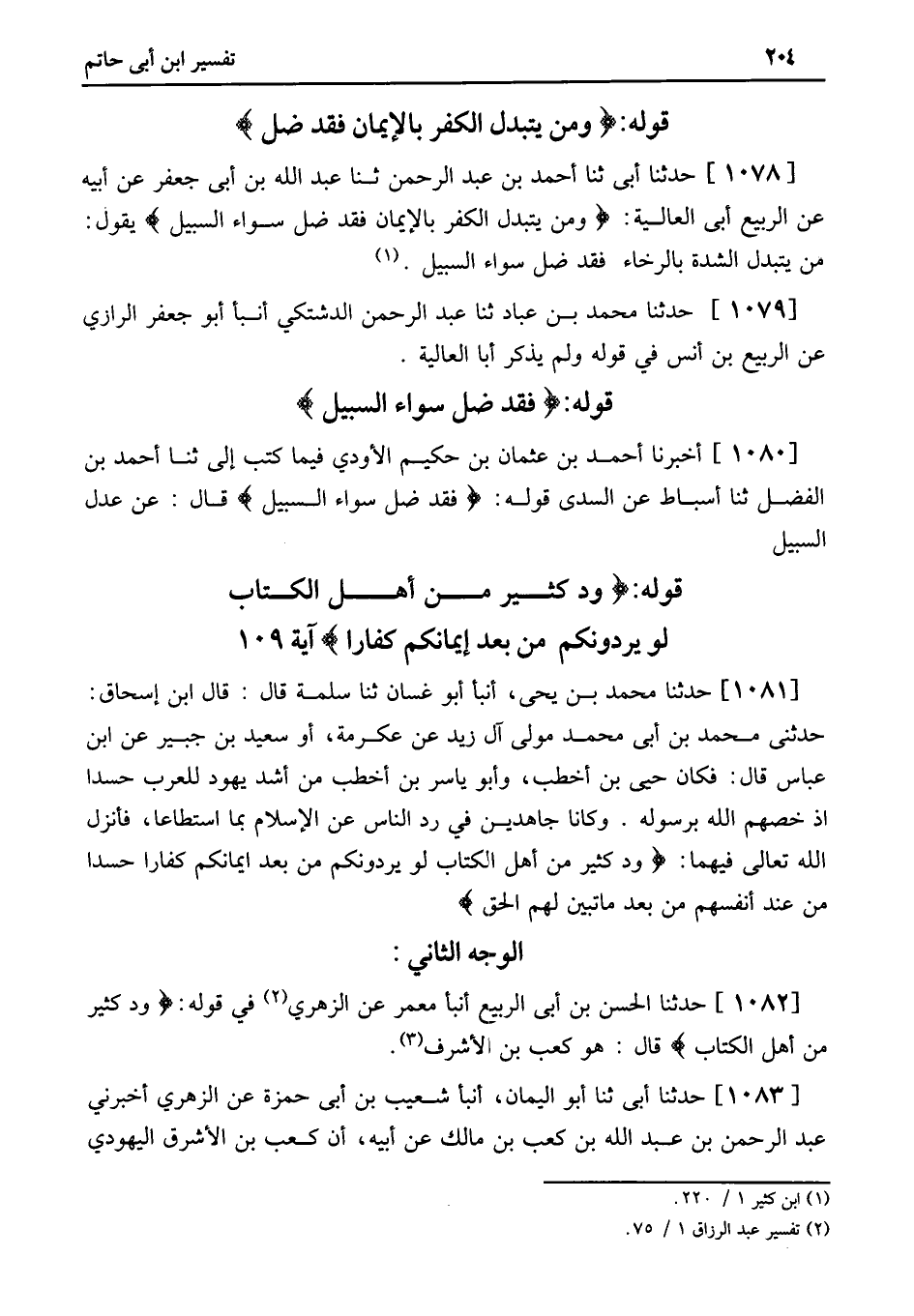1078 - حَدَّثَنَا أَبِي ثنا أَحْمَدُ بْنُ عَبْدِ الرَّحْمَنِ ثنا عَبْدُ اللَّهِ بْنُ أَبِي جَعْفَرٍ عَنْ أبيه عن الربيع أَبِي الْعَالِيَةِ: وَمَنْ يَتَبَدَّلِ الْكُفْرَ بِالإِيمَانِ فَقَدْ ضَلَّ سَوَاءَ السَّبِيلِ يَقُولُ: