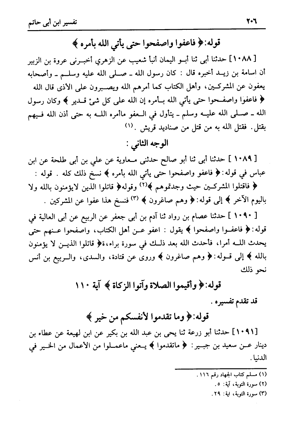 1089 - حَدَّثَنَا أَبِي ثنا أَبُو صَالِحٍ حَدَّثَنِي مُعَاوِيَةُ عَنْ عَلِيِّ بْنِ أَبِي طَلْحَةَ عَنِ ابْنِ عَبَّاسٍ فِي قَوْلِهِ: فَاعْفُوا وَاصْفَحُوا حَتَّى يَأْتِيَ اللَّهُ بِأَمْرِهِ نَسَخَ ذَلِكَ كُلَّهُ. قَوْلُهُ: