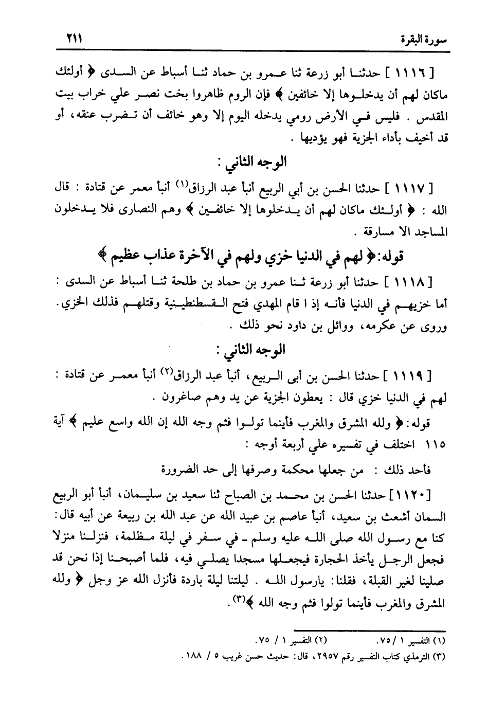 1116 - حَدَّثَنَا أَبُو زُرْعَةَ ثنا عَمْرُو بْنُ حَمَّادٍ ثنا أَسْبَاطٌ عَنِ السُّدِّيِّ أُولَئِكَ مَا كَانَ لَهُمْ أَنْ يَدْخُلُوهَا إِلا خَائِفِينَ فَإِنَّ الرُّومَ ظَاهَرُوا بُخْتَ نَصَّرَ عَلَى خَرَابِ بَيْتِ الْمَقْدِسِ. فَلَيْسَ فِي الأَرْضِ رُومِيٌّ يَدْخُلُهُ الْيَوْمَ إِلا وَهُوَ خَائِفٌ أَنْ تُضْرَبَ عُنُقُهُ، أَوْ قَدْ أُخِيفَ بِأَدَاءِ الْجِزْيَةِ فَهُوَ يُؤَدِّيهَا.