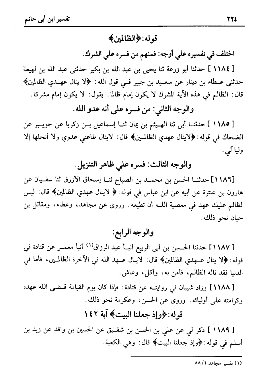 1186 - حَدَّثَنَا الْحَسَنُ بْنُ مُحَمَّدِ بْنِ الصَّبَّاحِ ثنا إِسْحَاقُ الأَزْرَقُ ثنا سُفْيَانُ عَنْ هَارُونَ بْنِ عَنْتَرَةَ عَنْ أَبِيهِ عَنِ ابْنِ عَبَّاسٍ فِي قَوْلِهِ: لَا يَنَالُ عَهْدِي الظَّالِمِينَ قَالَ: لَيْسَ لِظَالِمٍ عَلَيْكَ عَهْدٌ فِي مَعْصِيَةِ اللَّهِ أَنْ تُطِيعَهُ. وَرُوِيَ عَنْ مُجَاهِدٍ، وَعَطَاءٍ، وَمُقَاتِلِ بْنِ حَيَّانَ نَحْوُ ذَلِكَ.