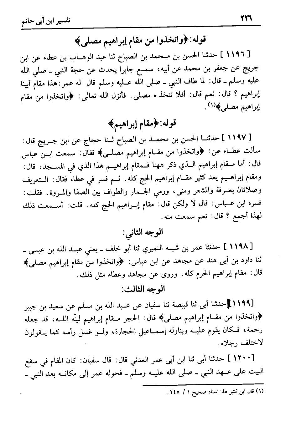 1199 - حَدَّثَنَا أَبِي ثنا قَبِيصَةُ ثنا سُفْيَانُ عَنْ عَبْدِ اللَّهِ بْنِ مُسْلِمٍ عَنْ سَعِيدِ بْنِ جُبَيْرٍ وَاتَّخِذُوا مِنْ مَقَامِ إِبْرَاهِيمَ مُصَلًّى قَالَ: الْحَجَرُ مَقَامُ إِبْرَاهِيمَ لَيَّنَهُ اللَّهُ، قَدْ جَعَلَهُ رَحْمَةً، فَكَانَ يَقُومُ عَلَيْهِ وَيُنَاوِلُهُ إِسْمَاعِيلُ الْحِجَارَةَ، وَلَوْ غَسَلَ رَأْسَهُ كَمَا يَقُولُونَ لاخْتَلَفَ رِجْلاهُ.