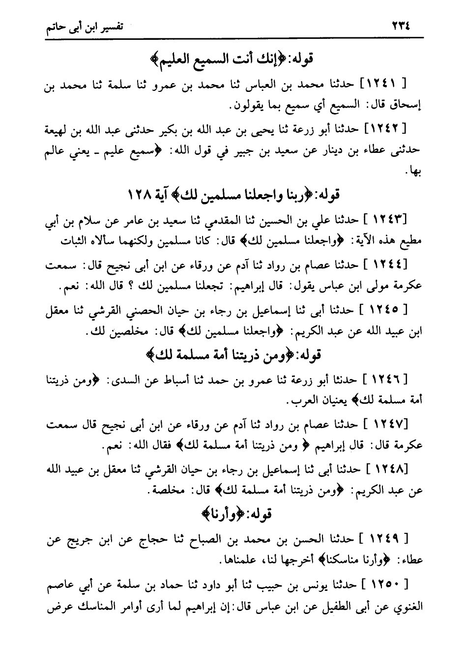 1246 - حَدَّثَنَا أَبُو زُرْعَةَ ثنا عَمْرُو بْنُ حَمَدٍ ثنا أَسْبَاطٌ عَنِ السُّدِّيِّ: وَمِنْ ذُرِّيَّتِنَا أُمَّةً مُسْلِمَةً لَكَ يَعْنِيَانِ الْعَرَبَ.