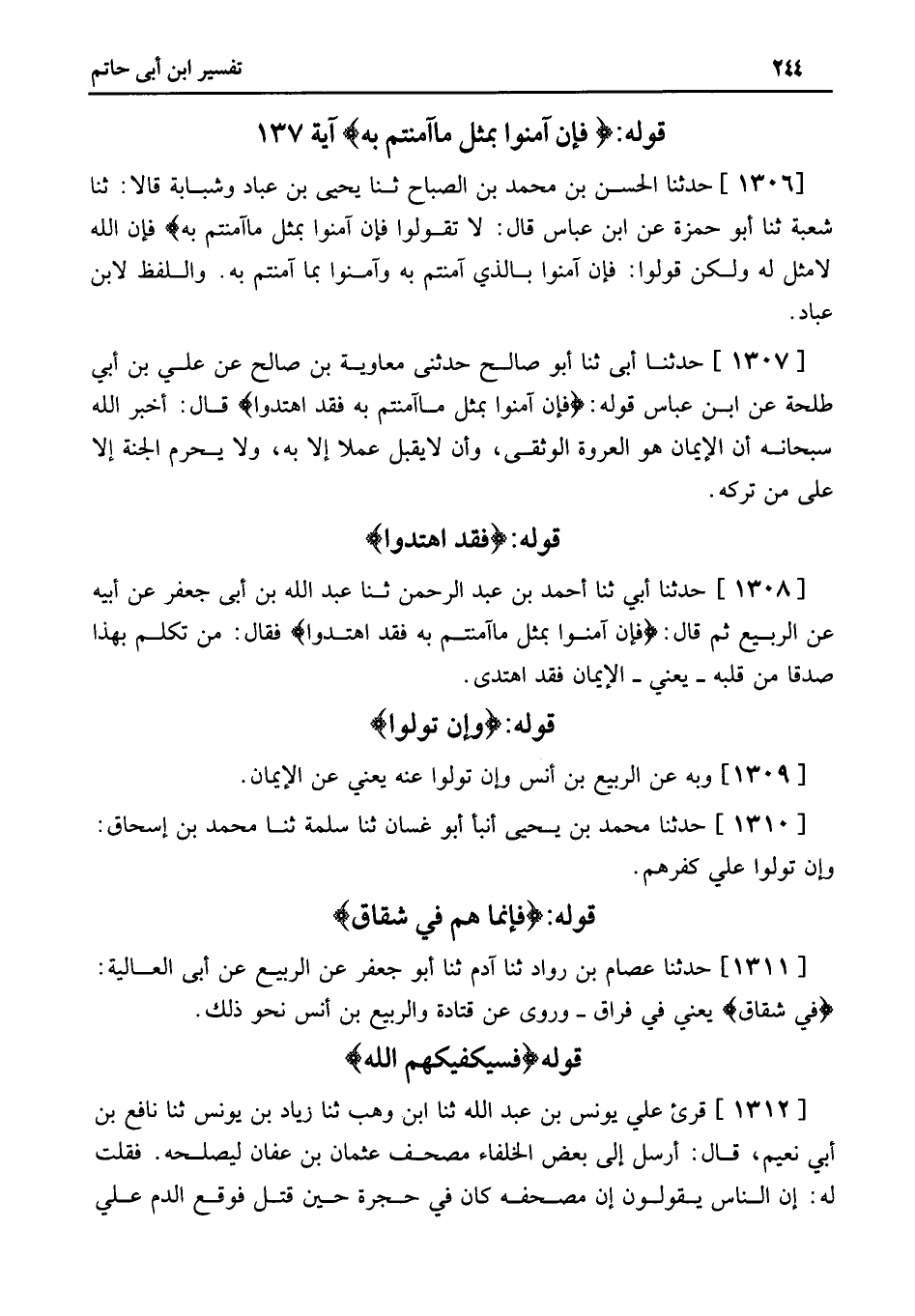1307 - حَدَّثَنَا أَبِي ثنا أَبُو صَالِحٍ حَدَّثَنِي مُعَاوِيَةُ بْنُ صَالِحٍ عَنْ عَلِيِّ بْنِ أَبِي طَلْحَةَ عَنِ ابْنِ عَبَّاسٍ قَوْلُهُ: فَإِنْ آمَنُوا بِمِثْلِ مَا آمَنْتُمْ بِهِ فَقَدِ اهْتَدَوْا قَالَ: أَخْبَرَ اللَّهُ سُبْحَانَهُ أَنَّ الْإِيمَانَ هُوَ العروة الوثقى، وأن لَا يَقْبَلَ عَمَلا إِلا بِهِ، وَلا يُحَرِّمُ الْجَنَّةَ إِلا عَلَى مَنْ تَرَكَهُ.