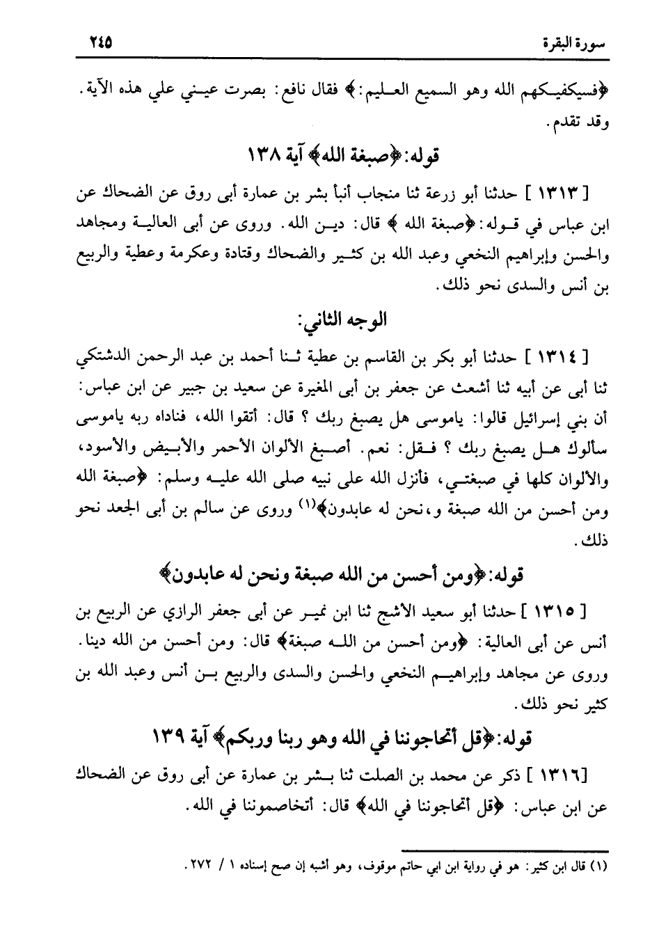 1313 - حَدَّثَنَا أَبُو زُرْعَةَ ثنا مِنْجَابٌ أَنْبَأَ بِشْرٌ بْنُ عُمَارَةَ أَبِي رَوْقٍ عَنِ الضَّحَّاكِ عَنِ ابْنِ عَبَّاسٍ فِي قَوْلِهِ: صِبْغَةَ اللَّهِ قَالَ: دِينُ اللَّهِ. وَرُوِيَ عَنْ أَبِي الْعَالِيَةِ وَمُجَاهِدٍ وَالْحَسَنِ وَإِبْرَاهِيمَ النَّخْعِيِّ وَعَبْدِ اللَّهِ بْنِ كَثِيرٍ وَالضَّحَّاكِ وَقَتَادَةَ وَعِكْرِمَةَ وَعَطِيَّةَ وَالرَّبِيعِ بْنِ أَنَسٍ وَالسُّدِّيِّ نَحْوُ ذَلِكَ.