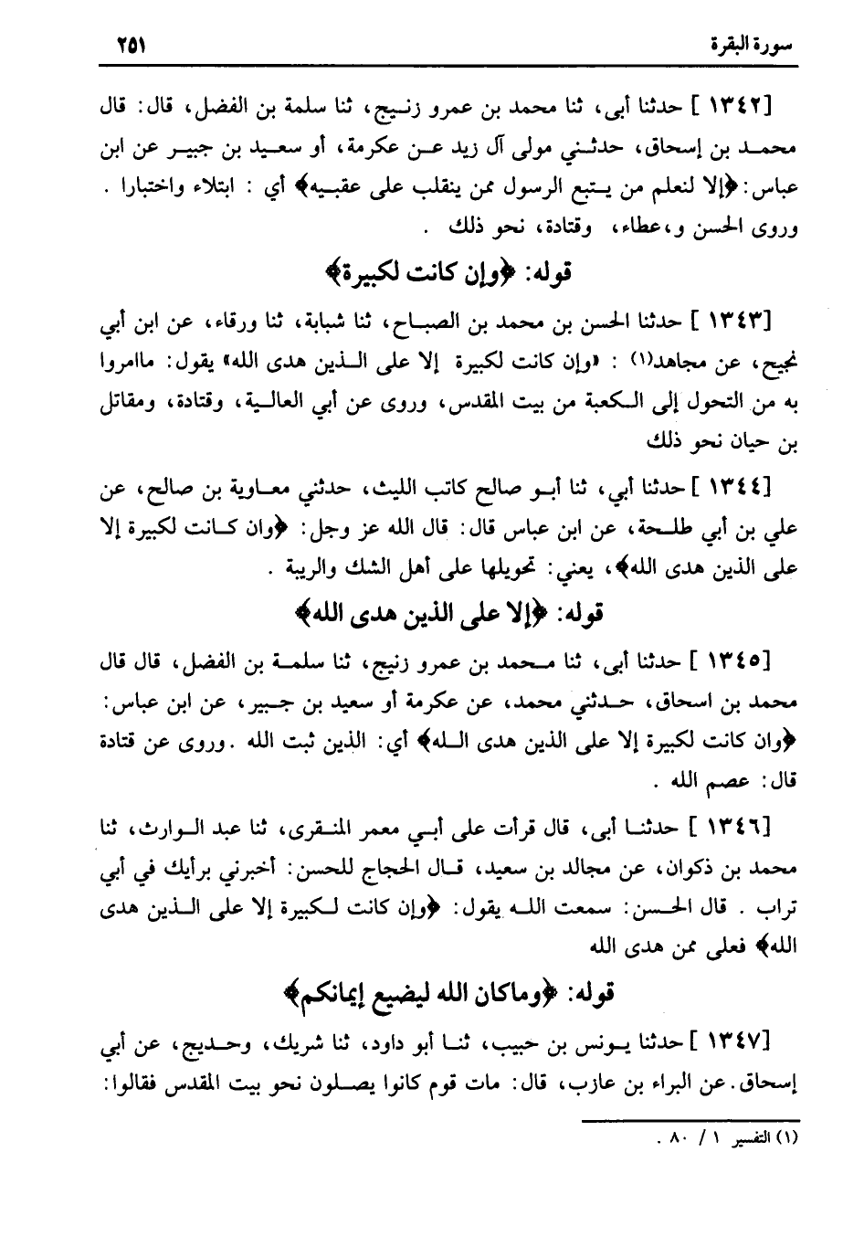 1343 - حَدَّثَنَا الْحَسَنُ بْنُ مُحَمَّدِ بْنِ الصَّبَّاحِ، ثنا شَبَابَةُ، ثنا وَرْقَاءُ، عَنِ ابْنِ أَبِي نَجِيحٍ، عَنْ مُجَاهِدٍ «1» «وَإِنْ كَانَتْ لَكَبِيرَةً إِلا عَلَى الَّذِينَ هَدَى اللَّهُ» يَقُولُ: مَا أُمِرُوا بِهِ مِنَ التَّحَوُّلِ إِلَى الْكَعْبَةِ مِنْ بَيْتِ الْمَقْدِسِ، وَرُوِيَ عَنْ أَبِي الْعَالِيَةِ، وَقَتَادَةَ، وَمُقَاتِلِ بْنِ حَيَّانَ نَحْوُ ذَلِكَ