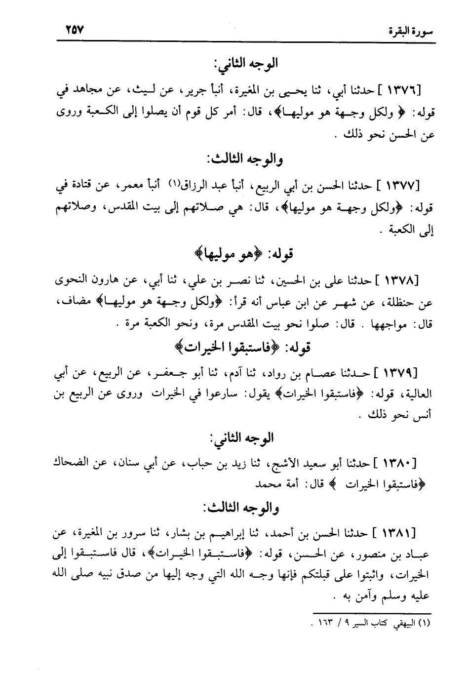 1377 - حَدَّثَنَا الْحَسَنُ بْنُ أَبِي الرَّبِيعِ، أَنْبَأَ عَبْدُ الرَّزَّاقِ «1» أَنْبَأَ مَعْمَرٌ، عَنْ قَتَادَةَ فِي قَوْلِهِ: لكل وِجْهَةٌ هُوَ مُوَلِّيهَا
