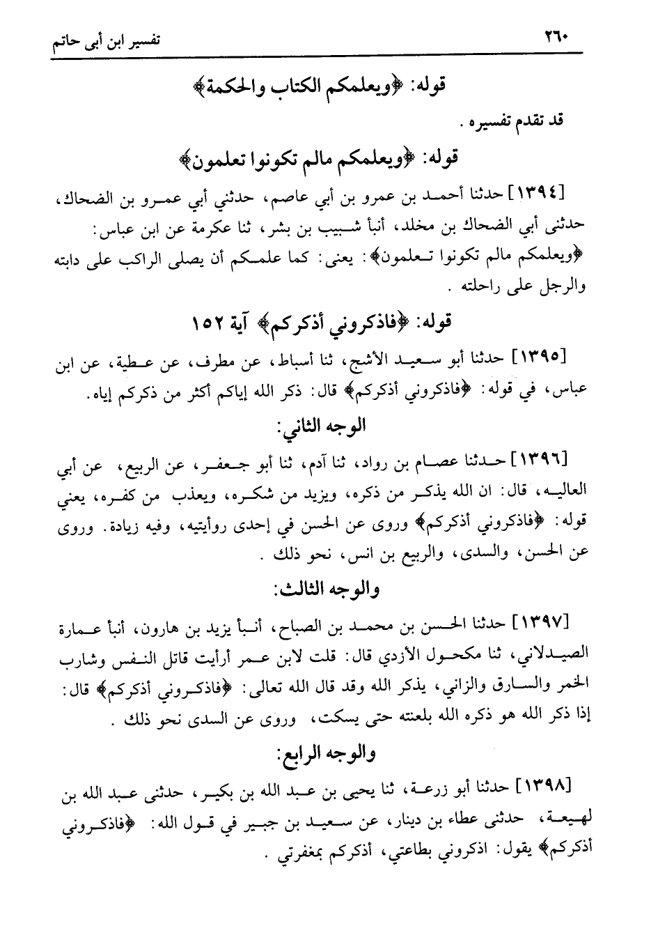1396 - حَدَّثَنَا عِصَامُ بْنُ رَوَّادٍ، ثنا آدَمُ، ثنا أَبُو جَعْفَرٍ، عَنِ الرَّبِيعِ، عَنْ أَبِي الْعَالِيَةِ، قَالَ: إِنَّ اللَّهَ يَذْكُرُ مَنْ ذَكَرَهُ، وَيَزِيدُ مَنْ شَكَرَهُ، وَيُعَذِّبُ مَنْ كَفَرَهُ، يَعْنِي قَوْلَهُ: فَاذْكُرُونِي أَذْكُرْكُمْ وَرُوِيَ عَنِ الْحَسَنِ فِي إِحْدَى رِوَايَتَيْهِ، وَفِيهِ زِيَادَةٌ. وَرُوِيَ عَنِ الْحَسَنِ، وَالسُّدِّيِّ، وَالرَّبِيعِ بْنِ أَنَسٍ، نَحْوُ ذَلِكَ.