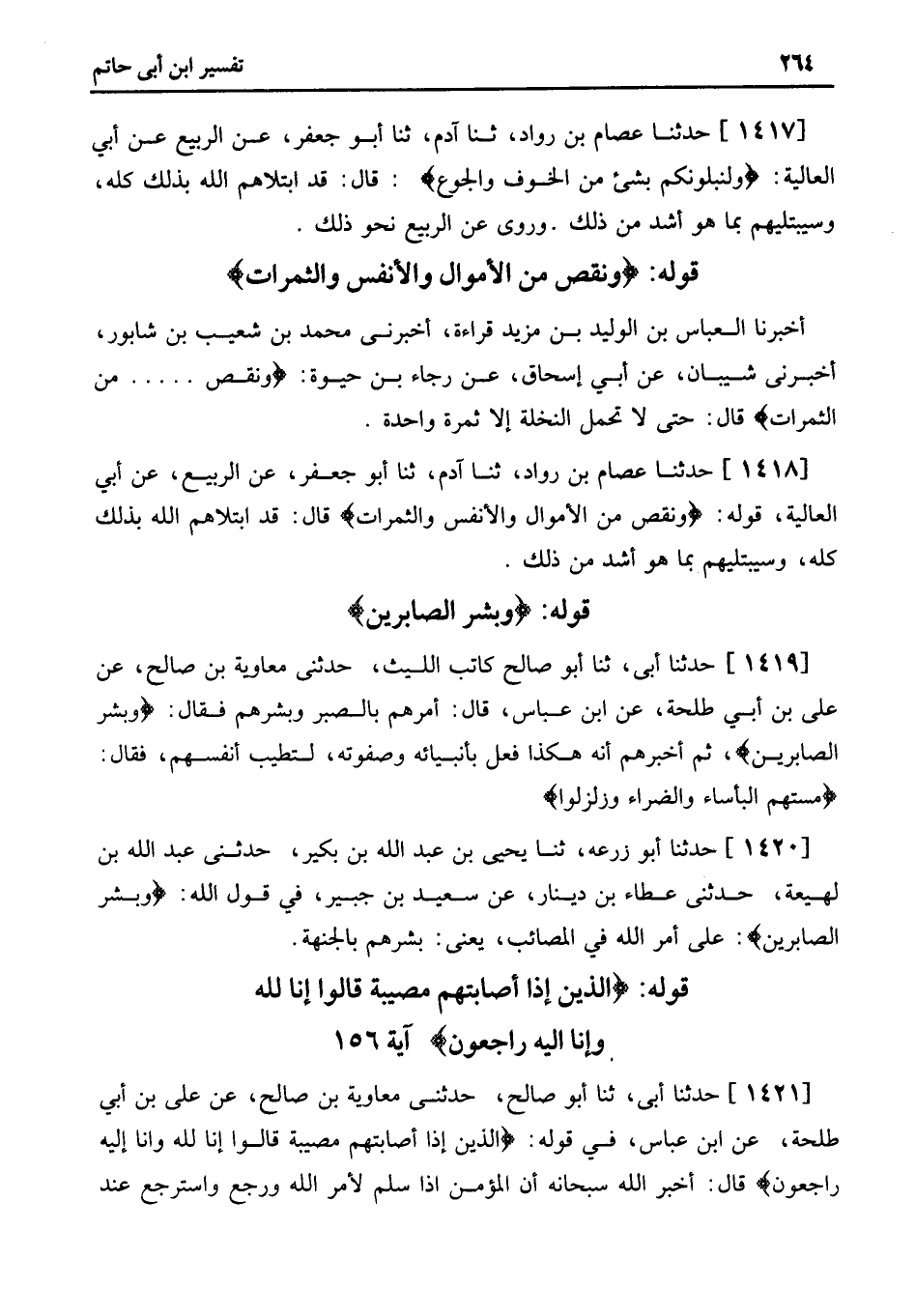 1419 - حَدَّثَنَا أَبِي، ثنا أَبُو صَالِحٍ كَاتِبُ اللَّيْثِ، حَدَّثَنِي مُعَاوِيَةُ بْنُ صَالِحٍ، عَنْ عَلِيِّ بْنِ أَبِي طَلْحَةَ، عَنِ ابْنِ عَبَّاسٍ، قَالَ: أَمَرَهُمْ بِالصَّبِرِ وَبَشَّرَهُمْ فَقَالَ: وَبَشِّرِ الصَّابِرِينَ، ثُمَّ أَخْبَرَهُمْ أَنَّهُ هَكَذَا فَعَلَ بَأَنْبِيَائِهِ وَصَفْوَتِهِ، لِتَطِيبَ أَنْفُسُهُمْ، فَقَالَ: