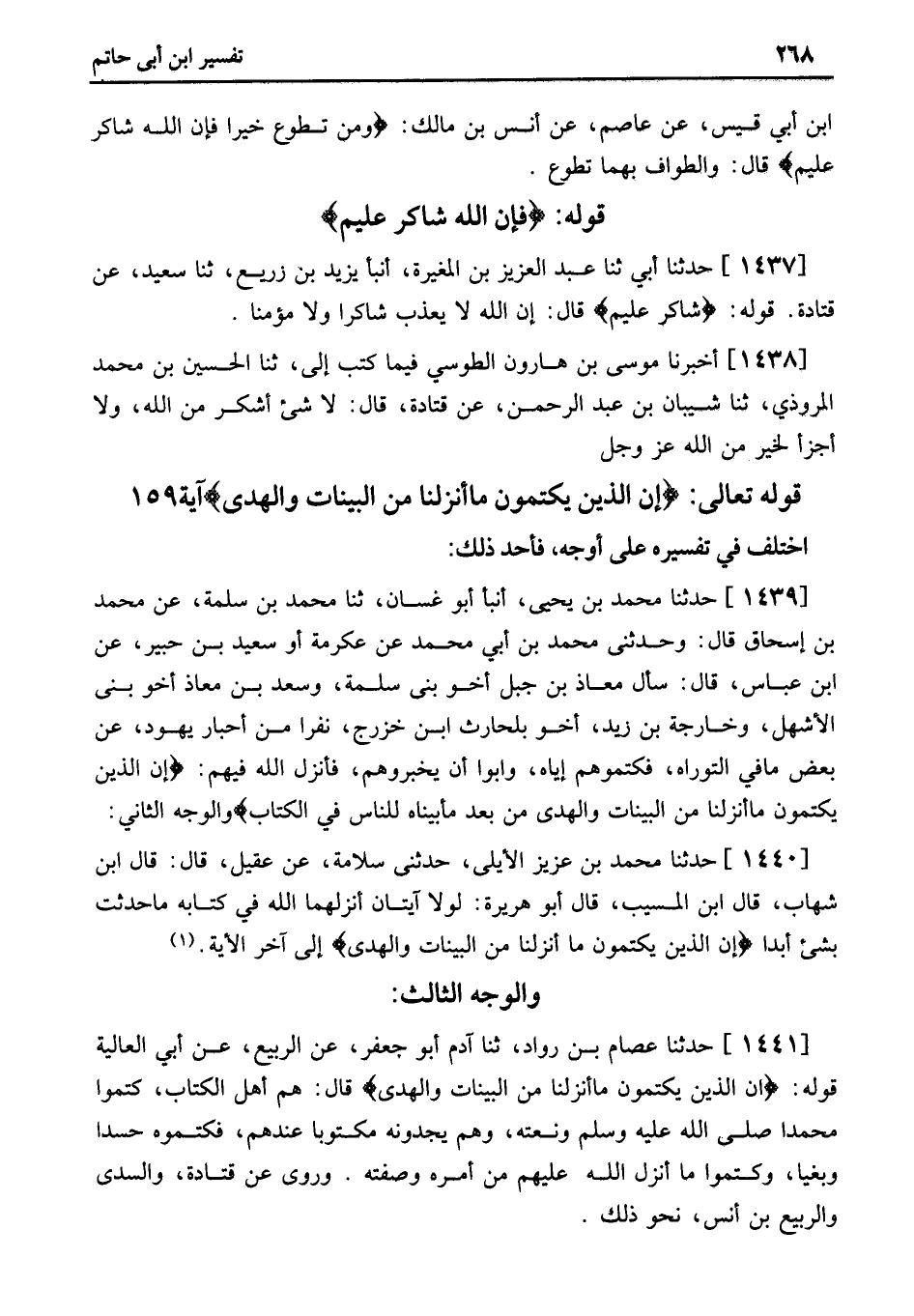 1441 - حَدَّثَنَا عِصَامُ بْنُ رَوَّادٍ، ثنا آدَمُ أَبُو جَعْفَرٍ، عَنِ الرَّبِيعِ، عَنْ أَبِي الْعَالِيَةِ قَوْلُهُ: إِنَّ الَّذِين يَكْتُمُونَ مَا أَنْزَلْنَا مِنَ الْبَيِّنَاتِ وَالْهُدَى قَالَ: هُمْ أَهْلُ الْكِتَابِ، كَتَمُوا مُحَمَّدًا صَلَّى اللَّهُ عَلَيْهِ وَسَلَّمَ وَنَعْتَهُ، وَهُمْ يَجِدُونَهُ مَكْتُوبًا عِنْدَهُمْ، فَكَتَمُوهُ حَسَدًا وَبَغْيًا، وَكَتَمُوا مَا أَنْزَلَ اللَّهُ عَلَيْهِمْ مِنْ أَمْرِهِ وَصِفَتِهِ. وَرُوِي عَنْ قَتَادَةَ، وَالسُّدِّيِّ وَالرَّبِيعِ بْنِ أَنَسٍ، نَحْوُ ذَلِكَ.