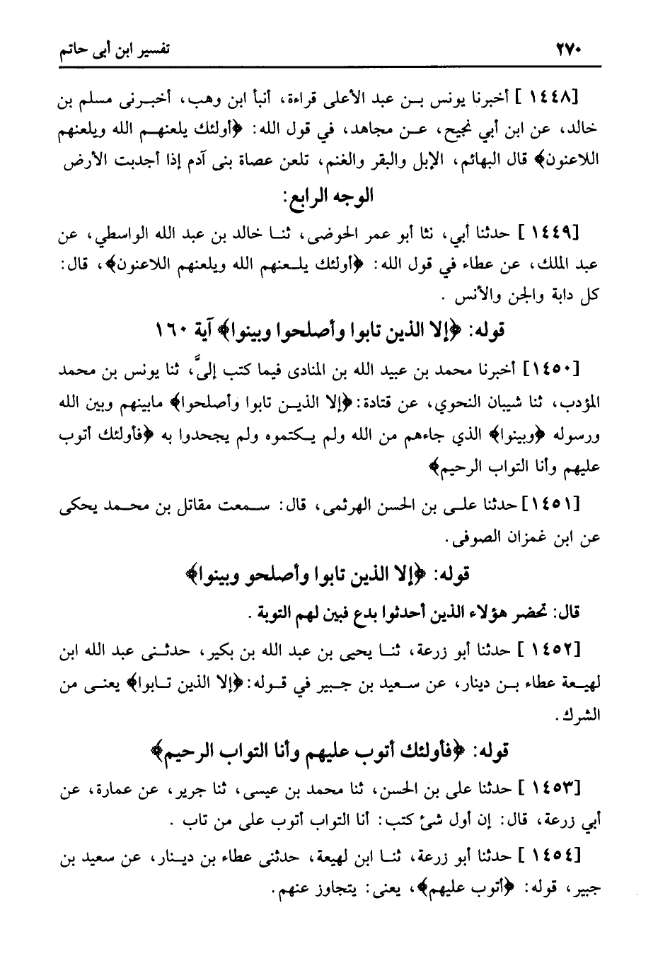 1450 - أَخْبَرَنَا مُحَمَّدُ بْنُ عُبَيْدِ اللَّهِ بْنِ الْمُنَادِي فِيمَا كَتَبَ إِلَيَّ، ثنا يُونُسُ بْنُ مُحَمَّدٍ الْمُؤَدِّبُ، ثنا شَيْبَانُ النَّحْوِيُّ، عَنْ قَتَادَةَ: إِلا الَّذِينَ تَابُوا وَأَصْلَحُوا مَا بَيْنَهُمْ وَبَيْنَ اللَّهِ وَرَسُولِهِ وَبَيَّنُوا الَّذِي جَاءَهُمْ مِنَ اللَّهِ وَلَمْ يَكْتُمُوهُ وَلَمْ يَجْحَدُوا بِهِ فَأُولَئِكَ أَتُوبُ عَلَيْهِمْ وَأَنَا التَّوَّابُ الرحيم