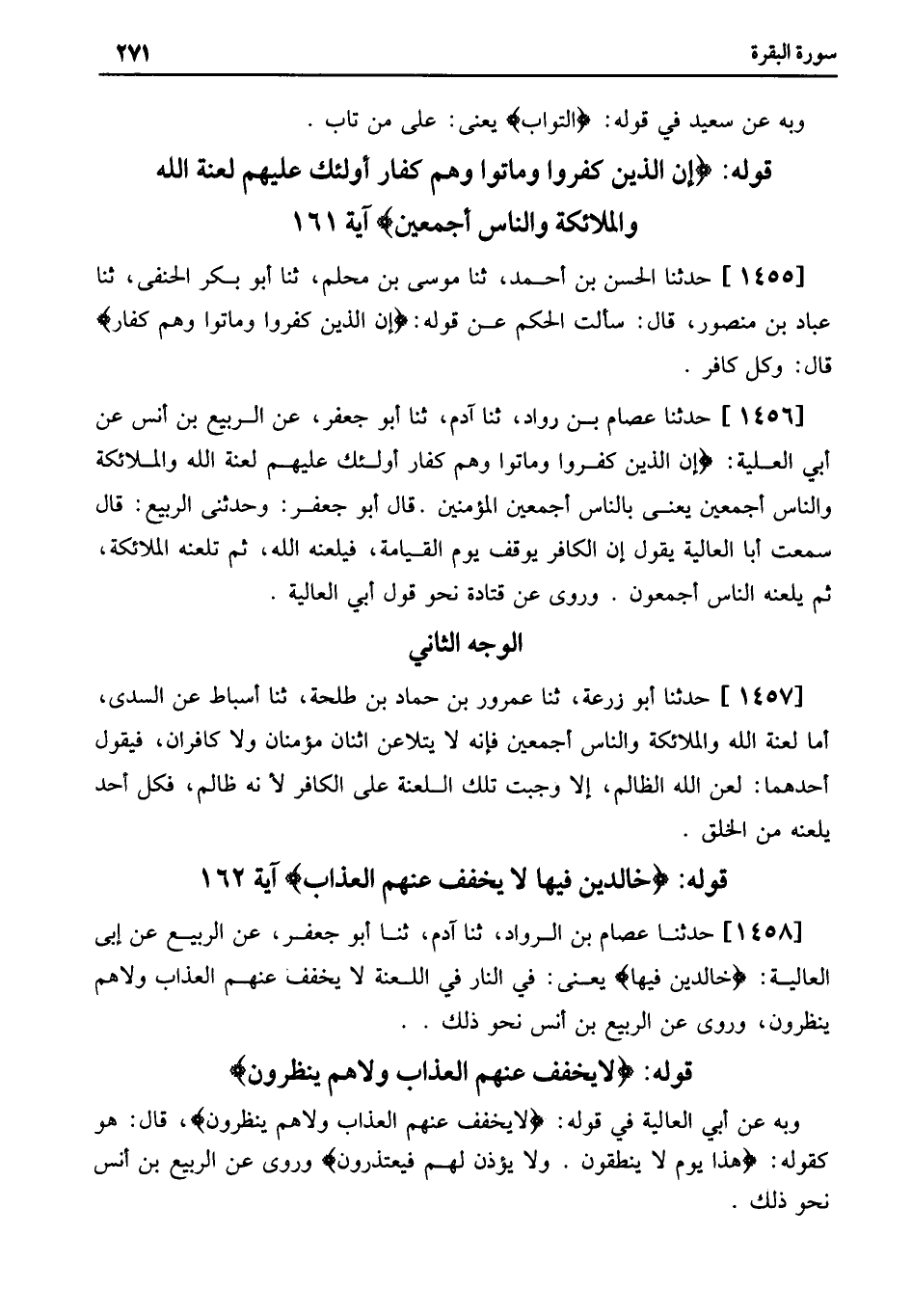 1458 - حَدَّثَنَا عِصَامُ بْنُ الرَّوَّادِ، ثنا آدَمُ، ثنا أَبُو جَعْفَرٍ، عَنِ الرَّبِيعِ عَنْ أَبِي الْعَالِيَةِ: خَالِدِينَ فِيهَا يَعْنِي: فِي النَّارِ فِي اللَّعْنَةِ لَا يُخَفَّفُ عَنْهُمُ الْعَذَابُ وَلَا هُمْ يَنْظُرُونَ، وَرُوِيَ عَنِ الرَّبِيعِ بْنِ أَنَسٍ نَحْوُ ذَلِكَ..