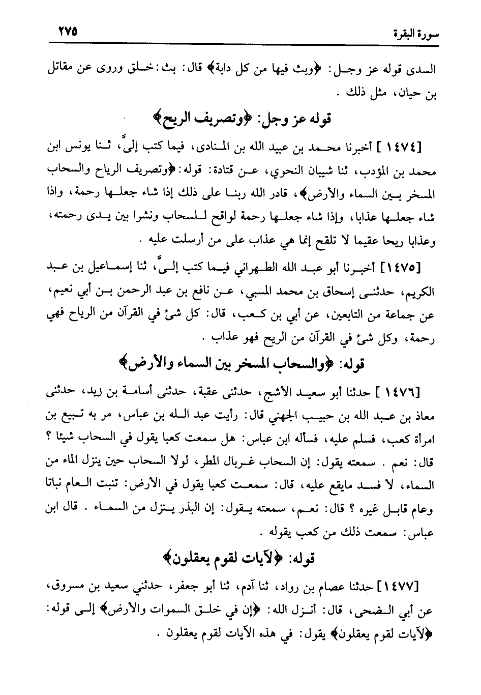1474 - أَخْبَرَنَا مُحَمَّدُ بْنُ عُبَيْدِ اللَّهِ بْنِ الْمُنَادِي، فِيمَا كَتَبَ إِلَيَّ، ثنا يونس ابن مُحَمَّدِ بْنِ الْمُؤَدِّبِ، ثنا شَيْبَانُ النَّحْوِيُّ، عَنْ قَتَادَةَ: قَوْلُهُ: وَتَصْرِيفِ الرِّيَاحِ وَالسَّحَابِ الْمُسَخَّرِ بَيْنَ السَّمَاءِ وَالأَرْضِ، قَادِرٌ اللَّهُ رَبُّنَا عَلَى ذَلِكَ إِذَا شَاءَ جَعَلَهَا رَحْمَةً، وَإِذَا شَاءَ جَعَلَهَا عَذَابًا، وَإِذَا شَاءَ جَعَلَهَا رَحْمَةً لَوَاقِحَ لِلسَّحَابِ وَنَشْرًا بَيْنَ يَدَيْ رَحْمَتِهِ، وَعَذَابًا رِيحًا عَقِيمًا لَا تُلْقِحُ إِنَّمَا هِيَ عَذَابٌ عَلَى مَنْ أُرْسِلَتْ عَلَيْهِ.