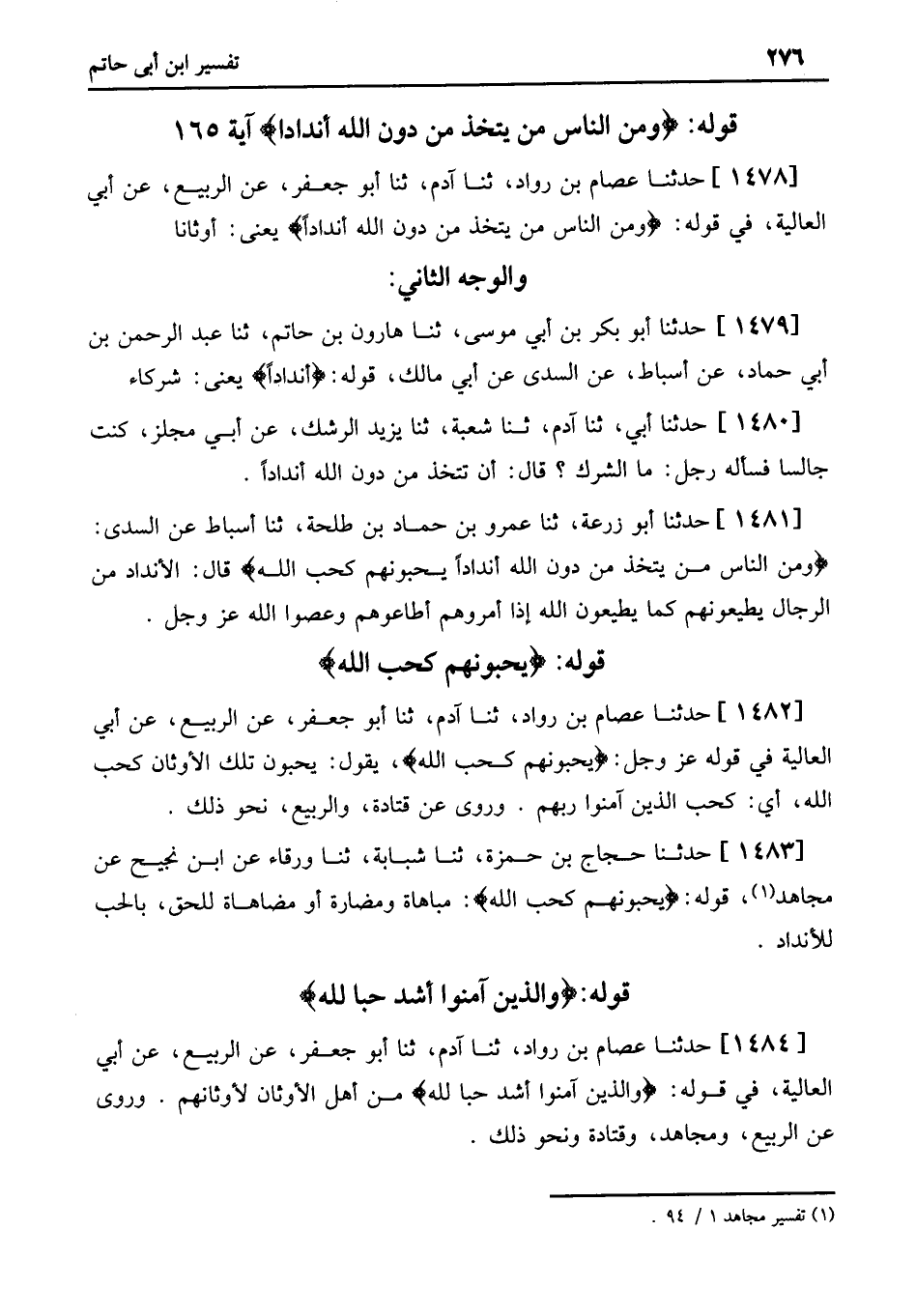 1482 - حَدَّثَنَا عِصَامُ بْنُ رَوَّادٍ، ثنا آدَمُ، ثنا أَبُو جَعْفَرٍ، عَنِ الرَّبِيعِ، عَنْ أَبِي الْعَالِيَةِ فِي قَوْلِهِ عَزَّ وَجَلَّ: يُحِبُّونَهُمْ كَحُبِّ اللَّهِ، يَقُولُ: يُحِبُّونَ تِلْكَ الأَوْثَانَ كَحُبِّ اللَّهِ، أَيْ: كَحُبِّ الَّذِينَ آمَنُوا رَبَّهُمْ. وَرُوِيَ عَنْ قَتَادَةَ، وَالرَّبِيعِ، نَحْوُ ذَلِكَ.