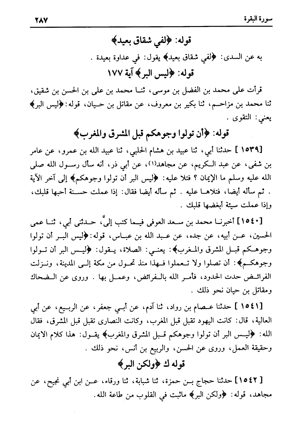 1540 - أَخْبَرَنَا مُحَمَّدُ بْنُ سَعْدٍ الْعَوْفِيُّ فِيمَا كَتَبَ إِلَيَّ، حَدَّثَنِي أَبِي، ثنا عَمِّي الْحُسَيْنُ، عَنْ أَبِيهِ، عَنْ جَدِّهِ، عَنْ عَبْدِ اللَّهِ بْنِ عَبَّاسٍ، قَوْلُهُ: لَيْسَ الْبِرَّ أَنْ تُوَلُّوا وُجُوهَكُمْ قِبَلَ الْمَشْرِقِ وَالْمَغْرِبِ يَعْنِي: الصَّلاةَ، يَقُولُ: لَيْسَ الْبِرَّ أَنْ تُوَلُّوا وُجُوهَكُمْ أَنْ تُصَلُّوا وَلا تَعْمَلُوا فَهَذَا مُنْذُ تَحَوَّلَ مِنْ مَكَّةَ إِلَى الْمَدِينَةِ، وَنَزَلَتِ الْفَرَائِضُ حُدَّتِ الْحُدُودُ، فَأَمَرَ اللَّهُ بِالْفَرَائِضِ، وَعَمِلَ بِهَا. وَرُوِيَ عَنِ الضَّحَّاكِ وَمُقَاتِلِ بْنِ حَيَّانَ نَحْوُ ذَلِكَ.