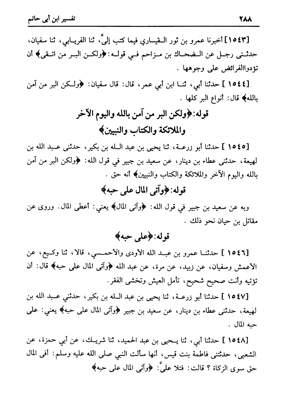 1545 - حَدَّثَنَا أَبو زُرْعَةَ، ثنا يَحْيَى بْنُ عَبْدِ اللَّهِ بْنِ بُكَيْرٍ، حَدَّثَنِي عَبْدُ اللَّهِ بْنُ لَهِيعَةَ، حَدَّثَنِي عَطَاءُ بْنُ دِينَارٍ، عَنْ سَعِيدِ بْنُ جُبَيْرٍ فِي قَوْلِ اللَّهِ: وَلَكِنَّ الْبِرَّ مَنْ آمَنَ بِاللَّهِ وَالْيَوْمِ الْآخِرِ وَالْمَلائِكَةِ وَالْكِتَابِ وَالنَّبِيِّينَ أَنَّهُ حَقٌّ.