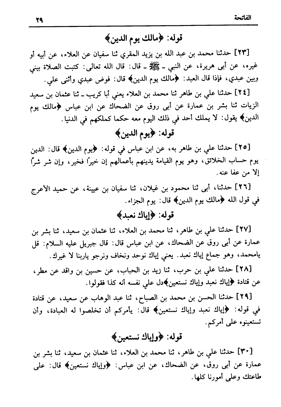 29 - حَدَّثَنَا الْحَسَنُ بْنُ مُحَمَّدِ بْنِ الصَّبَّاحِ، ثنا عَبْدُ الْوَهَّابِ عَنْ سَعِيدٍ، عَنْ قَتَادَةَ فِي قَوْلِهِ: إِيَّاكَ نَعْبُدُ وَإِيَّاكَ نَسْتَعِينُ قَالَ: يَأْمُرُكُمْ أَنْ تُخْلِصُوا لَهُ الْعِبَادَةَ، وَأَنْ تَسْتَعِينُوهُ عَلَى أَمَرَكُمْ.