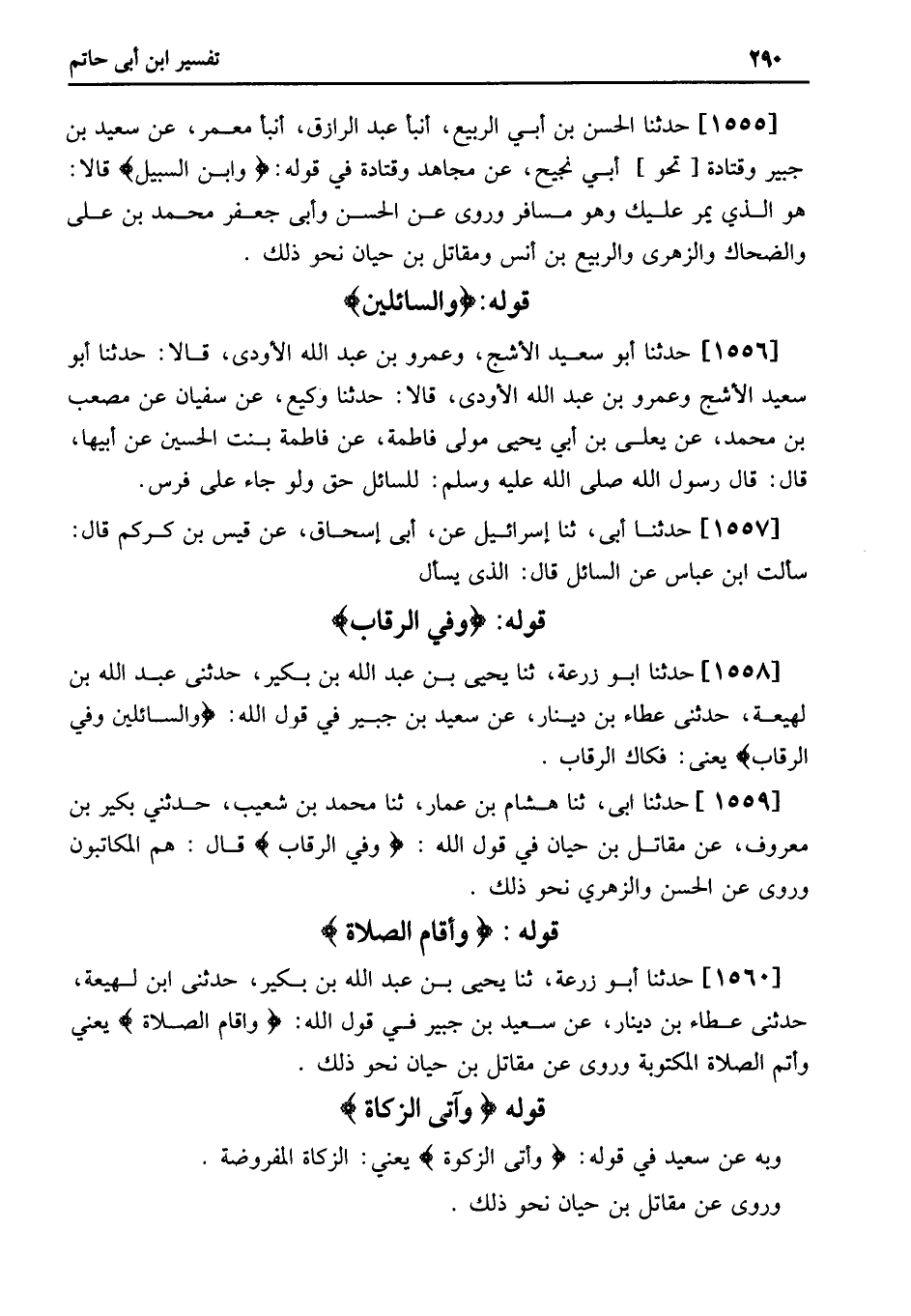 1558 - حَدَّثَنَا أَبُو زُرْعَةَ، ثنا يَحْيَى بْنُ عَبْدِ اللَّهِ بْنِ بُكَيْرٍ، حَدَّثَنِي عَبْدُ اللَّهِ بْنُ لَهِيعَةَ، حَدَّثَنِي عَطَاءُ بْنُ دِينَارٍ، عَنْ سَعِيدِ بْنُ جُبَيْرٍ فِي قَوْلِ اللَّهِ: وَالسَّائِلِينَ وَفِي الرِّقَابِ يَعْنِي: فِكَاكَ الرِّقَابِ.