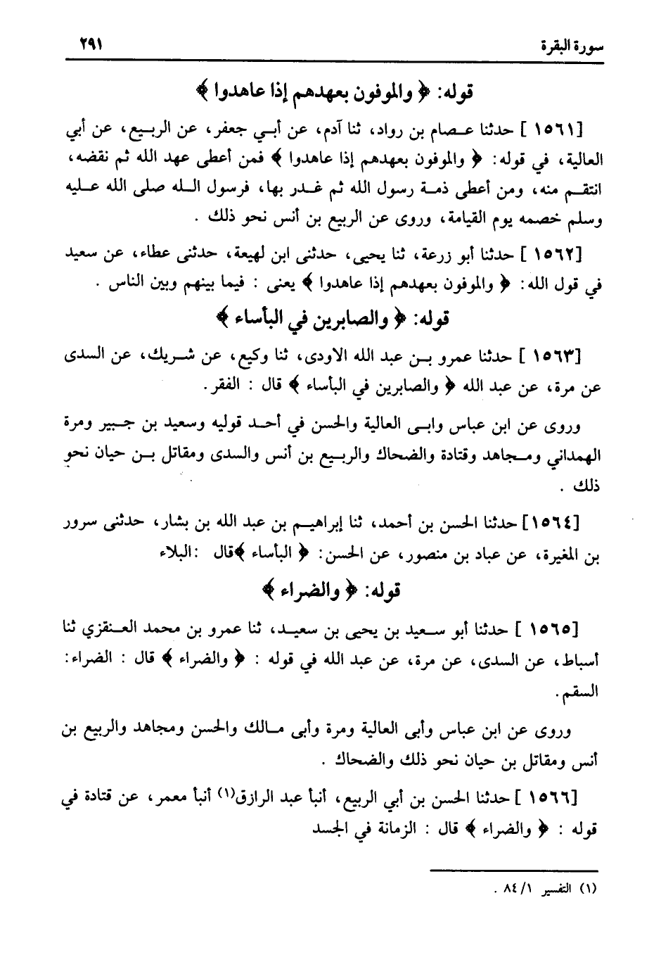 1563 - حَدَّثنا عَمْرُو بْنُ عَبْدِ اللَّهِ الأَوْدِيُّ، ثنا وَكِيعٌ، عَنْ شَرِيكٍ، عَنِ السُّدِّيِّ عَنْ مُرَّةَ، عَنْ عَبْدِ اللَّهِ وَالصَّابِرِينَ فِي الْبَأْسَاءِ قَالَ: الْفَقْرُ.