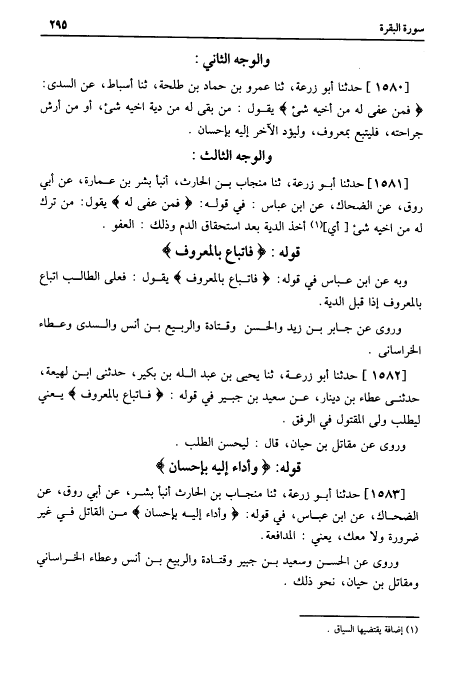 1583 - حَدَّثَنَا أَبُو زُرْعَةَ، ثنا مِنْجَابُ بْنُ الْحَارِثِ أَنْبَأَ بِشْرٌ، عَنْ أَبِي رَوْقٍ، عَنِ الضَّحَّاكِ، عَنِ ابْنِ عَبَّاسٍ، فِي قَوْلِهِ: وَأَدَاءٌ إِلَيْهِ بِإِحْسَانٍ مِنَ الْقَاتِلِ فِي غَيْرِ ضَرُورَةٍ وَلا مَعْكٍ، يَعْنِي: الْمُدَافَعَةَ.
