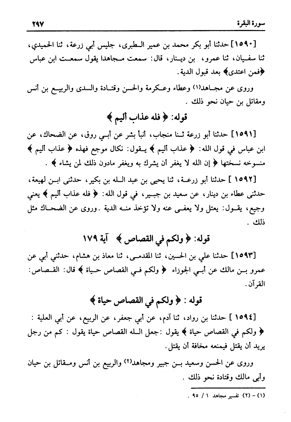 1590 - حَدَّثَنَا أَبُو بَكْرٍ مُحَمَّدُ بْنُ عُمَيْرٍ الطَّبَرِيُّ، جَلِيسُ أَبِي زُرْعَةَ، ثنا الْحُمَيْدِيُّ، ثنا سُفْيَانُ، ثنا عَمْرُو، بْنُ دِينَارٍ، قَالَ: سَمِعْتُ مُجَاهِدًا يَقُولُ سَمِعْتُ ابْنَ عَبَّاسٍ فَمَنِ اعْتَدَى بَعْدَ قَبُولِ الدِّيَةِ.