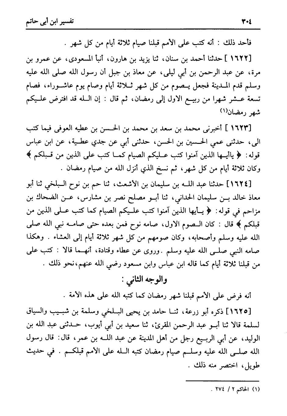 1624 - حَدَّثَنَا عَبْدُ اللَّهِ بْنُ سُلَيْمَانَ بْنِ الأَشْعَثَ، ثنا حَمُ بْنُ نُوحٍ الْبَلْخِيُّ ثنا أَبُو مُعَاذٍ خَالِدُ بْنُ سُلَيْمَانَ الْحُدَّانِيُّ، ثنا أَبُو مُصْلِحٍ نَصْرُ بْنُ مُشَارِسٍ، عَنِ الضَّحَّاكِ بْنِ مُزَاحِمٍ فِي قَوْلِهِ: يَا أَيُّهَا الَّذِينَ آمَنُوا كُتِبَ عَلَيْكُمُ الصِّيَامُ كَمَا كُتِبَ عَلَى الَّذِينَ مِنْ قَبْلِكُمْ قَالَ: كَانَ الصَّوْمُ الأَوَّلُ، صَامَهُ نُوحٌ فَمَنْ بَعْدَهُ حَتَّى صَامَهُ نَبِيُّ اللَّهِ صَلَّى اللَّهُ عَلَيْهِ وَسَلَّمَ وَأَصْحَابُهُ، وَكَانَ صَوْمُهُمْ مِنْ كُلِّ شَهْرٍ ثَلاثَةَ أَيَّامٍ إِلَى الْعِشَاءِ. وَهَكَذَا صَامَهُ النَّبِيُّ صَلَّى اللَّهُ عَلَيْهِ وَسَلَّمَ. وَرُوِيَ عَنْ عَطَاءٍ وَقَتَادَةَ، أَنَّهُمَا قَالا: كُتِبَ عَلَى مَنْ قَبْلَنَا ثَلاثَةُ أَيَّامٍ كَمَا قَالَهُ ابْنُ عَبَّاسٍ وَابْنُ مَسْعُودٍ رَضِيَ اللَّهُ عَنْهُمْ، نَحْوَ ذَلِكَ.