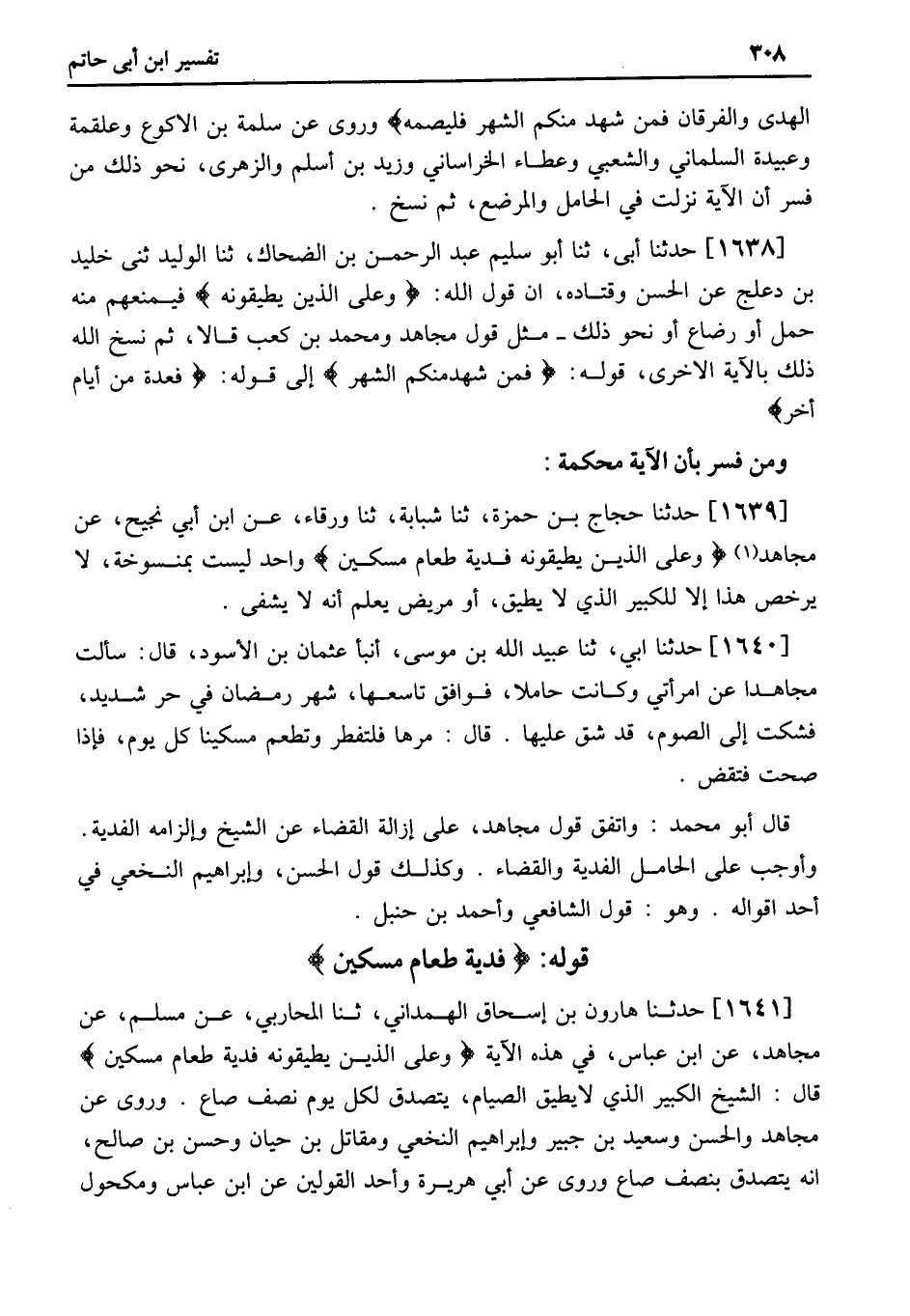 1641 - حَدَّثَنَا هَارُونُ بْنُ إِسْحَاقَ الْهَمْدَانِيُّ، ثنا الْمُحَارِبِيُّ، عَنْ مُسْلِمٍ، عَنْ مُجَاهِدٍ، عَنِ ابْنِ عَبَّاسٍ، فِي هَذِهِ الآيَةِ وَعَلَى الَّذِينَ يُطِيقُونَهُ فِدْيَةٌ طَعَامُ مِسْكِينٍ قَالَ: الشَّيْخُ الْكَبِيرُ الَّذِي لَا يُطِيقُ الصِّيَامَ، يَتَصَدَّقُ لِكُلِّ يوم نصف صَاعٍ.