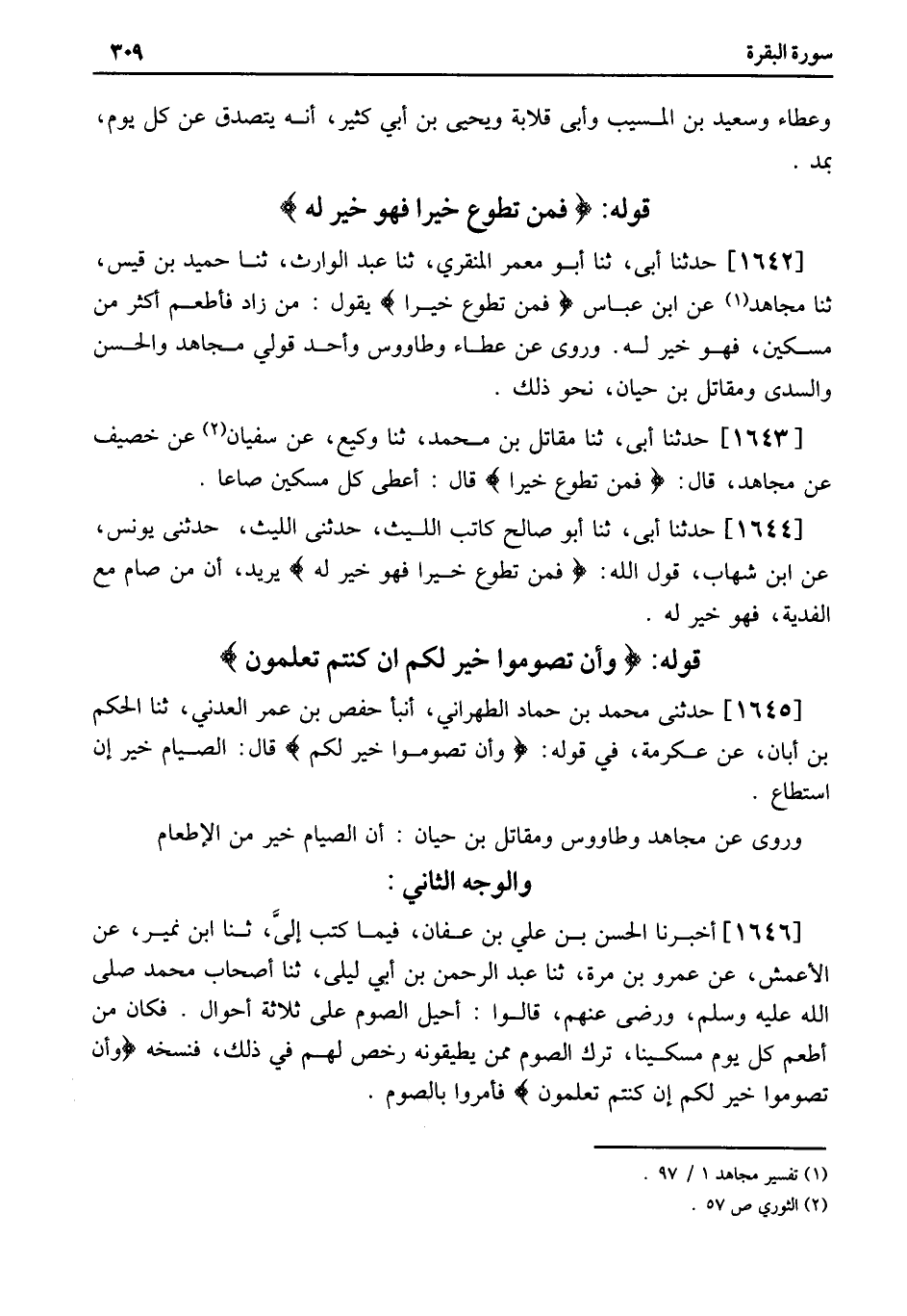 1643 - حَدَّثَنَا أَبِي، ثنا مُقَاتِلُ بْنُ مُحَمَّدٍ، ثنا وَكِيعٌ، عَنْ سُفْيَانَ «2» عَنْ خُصَيْفٍ عَنْ مُجَاهِدٍ، قَالَ: فَمَنْ تَطَوَّعَ خَيْرًا قَالَ: أَعْطَى كُلَّ مِسْكِينٍ صَاعًا.