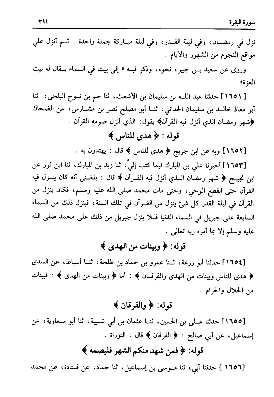1654 - حَدَّثَنَا أَبُو زُرْعَةَ، ثنا عَمْرُو بْنُ حَمَّادٍ بْنِ طَلْحَةَ، ثنا أَسْبَاطٌ، عَنِ السُّدِّيِّ هُدًى لِلنَّاسِ وَبَيِّنَاتٍ مِنَ الْهُدَى وَالْفُرْقَانِ أَمَّا وَبَيِّنَاتٍ مِنَ الْهُدَى فَبَيِّنَاتٌ مِنَ الْحَلالِ وَالْحَرَامِ.