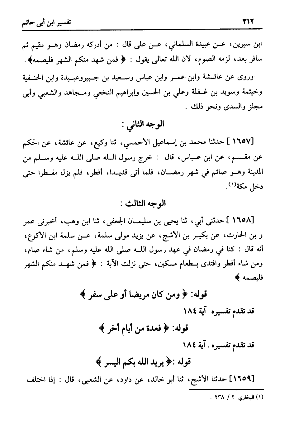 1658 - حَدَّثَنِي أَبِي، ثنا يَحْيَى بْنُ سُلَيْمَانَ الْجُعْفِيُّ، ثنا ابْنُ وَهْبٍ، أخبرني عمر وبن الْحَارِثِ، عَنْ بُكَيْرِ بْنِ الأَشَجِّ، عَنْ يَزِيدَ مولى سلمة، عن سلمة ابن الأَكْوَعِ، أَنَّهُ قَالَ: كُنَّا فِي رَمَضَانَ فِي عَهْدِ رَسُولِ اللَّهِ صَلَّى اللَّهُ عَلَيْهِ وَسَلَّمَ، مَنْ شَاءَ صَامَ، وَمَنْ شَاءَ أَفْطَرَ وَافْتَدَى بِطَعَامِ مِسْكِينٍ، حَتَّى نَزَلَتِ الآيَةُ: فَمَنْ شَهِدَ منكم الشهر فليصمه