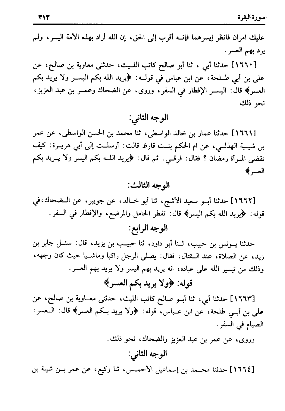 1660 - حَدَّثَنَا أَبِي، ثنا أَبُو صَالِحٍ كَاتِبُ اللَّيْثِ، حَدَّثَنِي مُعَاوِيَةُ بْنُ صَالِحٍ، عَنْ عَلِيِّ بْنِ أَبِي طَلْحَةَ، عَنِ ابْنِ عَبَّاسٍ فِي قَوْلِهِ: يُرِيدُ اللَّهُ بِكُمُ الْيُسْرَ وَلا يُرِيدُ بِكُمُ الْعُسْرَ قَالَ: الْيُسْرُ الإِفْطَارُ فِي السَّفَرِ، وَرُوِيَ، عَنِ الضَّحَّاكِ وَعُمَرَ بْنِ عَبْدِ الْعَزِيزِ، نَحْوُ ذَلِكَ