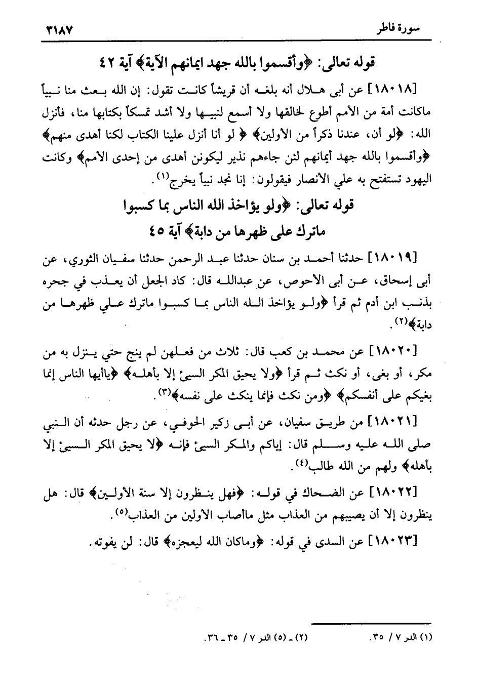 18022 - عَنِ الضَّحَّاكِ فِي قَوْلِهِ: فَهَلْ يَنْظُرُونَ إِلا سُنَّتَ الْأَوَّلِينَ قَالَ: هَلْ يَنْظُرُونَ إِلا أَنْ يُصِيبَهُمْ مِنَ الْعَذَابِ مِثْلُ مَا أَصَابَ الْأَوَّلِينَ مِنَ الْعَذَابِ «5» .