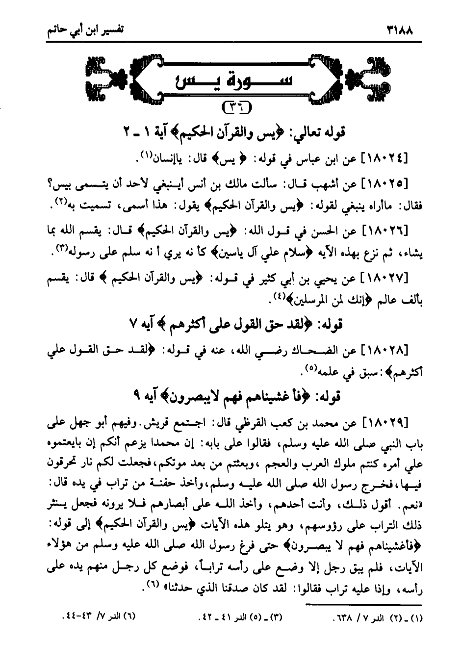 18026 - عن الْحَسَن فِي قول اللَّه: يس وَالْقُرْآنِ الْحَكِيمِ قَالَ: يُقْسِمُ اللَّهُ بِمَا يَشَاءُ، ثُمَّ نَزَعَ بِهَذِهِ الْآيَةِ سَلامٌ عَلَى إِلْ يَاسِينَ كَأَنَّهُ يَرَى أَنَّهُ سَلَّمَ عَلَى رَسُولِهِ «3» .
