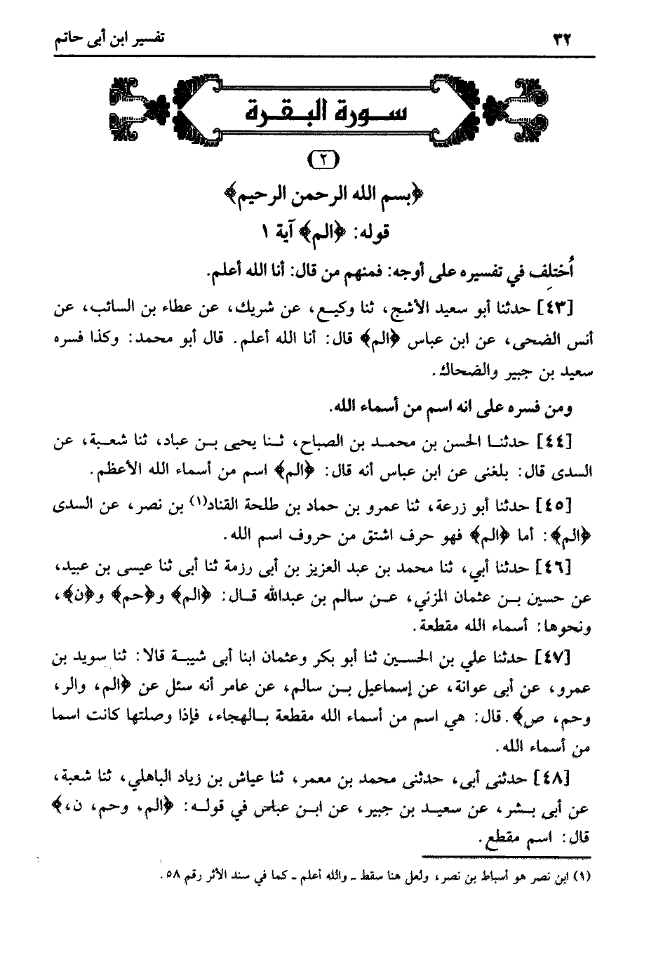 45 - حَدَّثَنَا أَبُو زُرْعَةَ، ثنا عَمْرُو بْنُ حَمَّادِ بْنِ طَلْحَةَ القناد «1» بْنُ نَصْرٍ، عَنِ السُّدِّيِّ الم: أَمَّا الم فَهُوَ حَرْفٌ اشْتُقَّ مِنْ حُرُوفِ اسْمِ اللَّهِ.