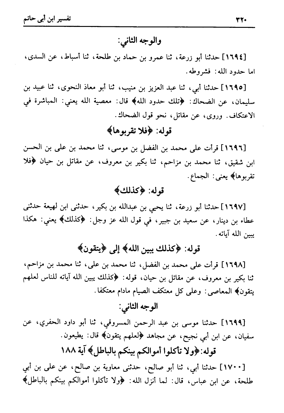 1698 - قَرَأْتُ عَلَى مُحَمَّدِ بْنِ الْفَضْلِ، ثنا مُحَمَّدُ بْنُ عَلِيٍّ، ثنا مُحَمَّدُ بْنُ مُزَاحِمٍ، ثنا بُكَيْرُ بْنُ مَعْرُوفٍ، عَنْ مُقَاتِلِ بْنِ حَيَّانَ، قَوْلُهُ: كَذَلِكَ يُبَيِّنُ اللَّهُ آيَاتِهِ لِلنَّاسِ لَعَلَّهُمْ يتقون المعاصي: وعلى كل معتكف الصيام مادام مُعْتَكِفًا.