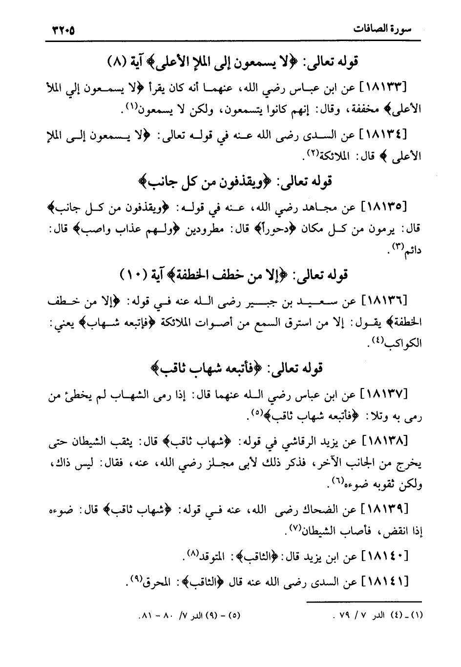 18137 - عَنِ ابْنِ عَبَّاسٍ رَضِيَ اللهُ عَنْهُمَا قَالَ: إِذَا رُمِيَ الشِّهَابُ لَمْ يُخْطِئْ مَنْ رَمَى بِهِ وَتَلا: فَأَتْبَعَهُ شِهَابٌ ثَاقِبٌ «5» .