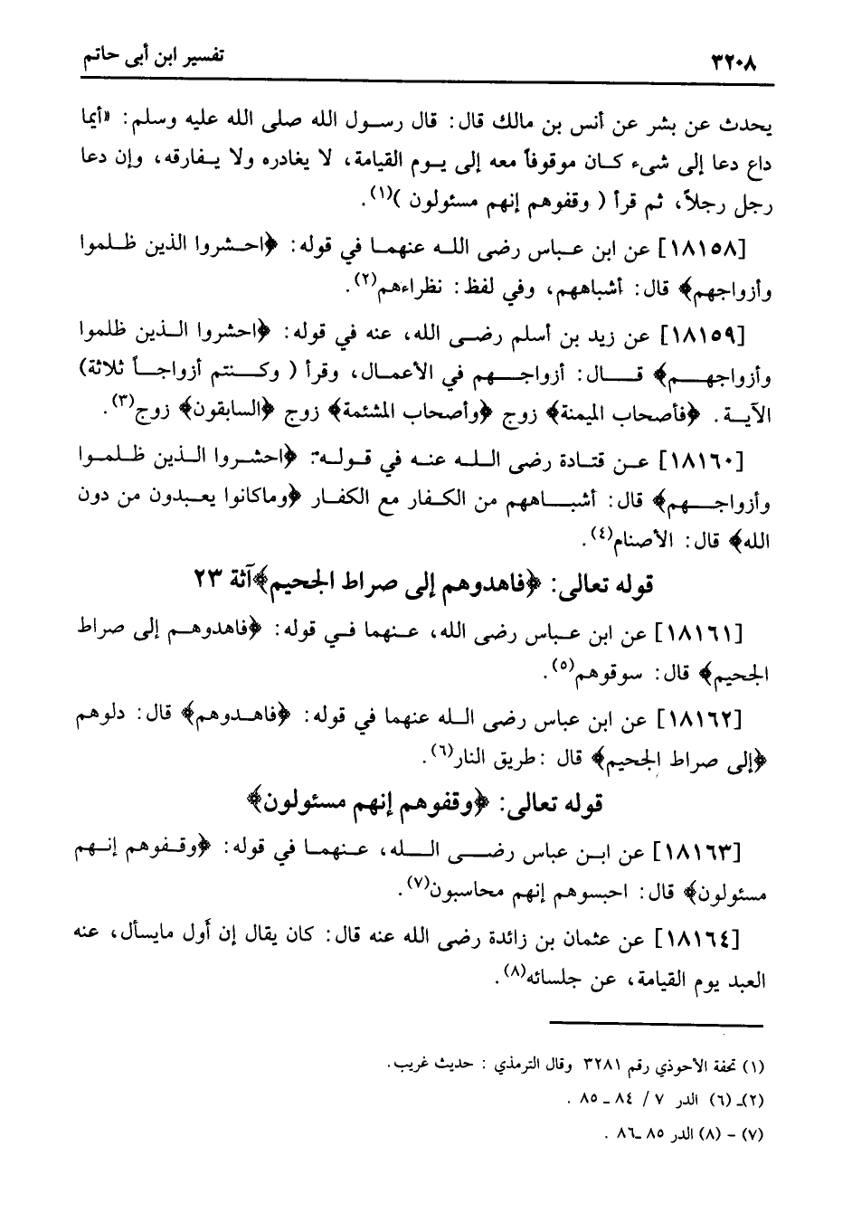 18161 - عَنِ ابْنِ عَبَّاسٍ رَضِيَ اللَّهُ، عَنْهُمَا في قوله: فَاهْدُوهُمْ إِلَى صِرَاطِ الْجَحِيمِ قَالَ: سُوقُوهُمْ «5» .