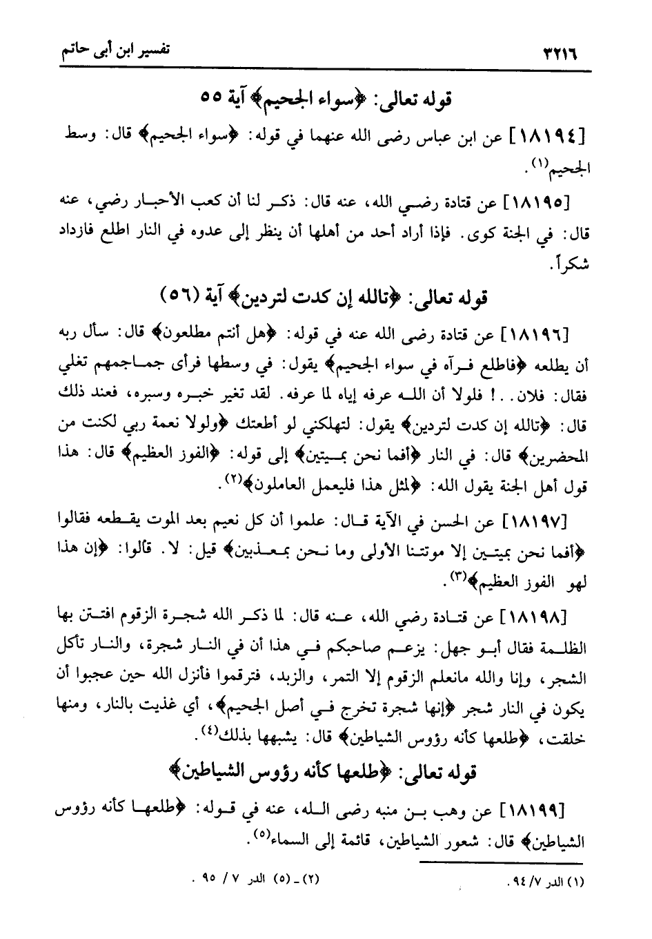 18199 - عَنْ وَهْبِ بْنِ مُنَبِّهٍ رَضِيَ اللهُ، عَنْهُ في قوله: طلعها كأنه رؤس الشَّيَاطِينِ قَالَ: شُعُورُ الشَّيَاطِينِ، قَائِمَةٌ إِلَى السَّمَاءِ «5» .