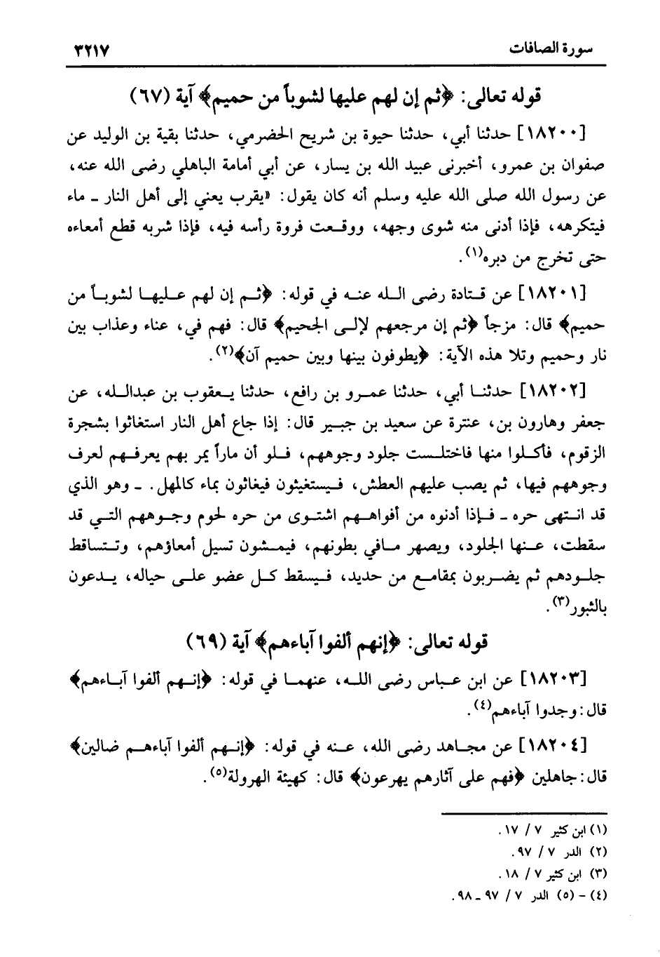 18201 - عَنْ قَتَادَة رَضِيَ اللهُ عَنْهُ فِي قَوْلِهِ: ثُمَّ إِنَّ لَهُمْ عَلَيْهَا لَشَوْبًا مِنْ حَمِيمٍ قَالَ: مَزْجًا ثُمَّ إِنَّ مَرْجِعَهُمْ لالَى الْجَحِيمِ قَالَ: فَهُمْ فِي، عَنَاءٍ وَعَذَابٍ بَيْنَ نَارٍ وَحَمِيمٍ وَتَلا هَذِهِ الْآيَةَ: يَطُوفُونَ بَيْنَهَا وَبَيْنَ حَمِيمٍ آنٍ «2» .