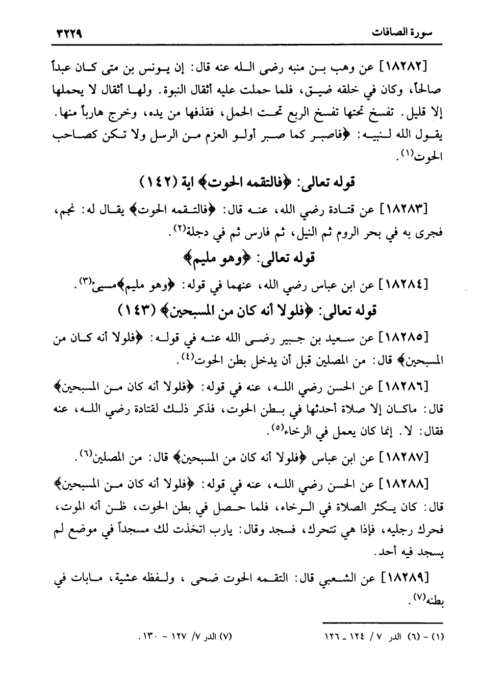 18285 - عَنْ سَعِيدِ بْنِ جُبَيْرٍ رَضِيَ اللهُ عَنْهُ فِي قَوْلِهِ: فَلَوْلا أَنَّهُ كَانَ مِنَ الْمُسَبِّحِينَ قَالَ: مِنَ الْمُصَلِّينَ قَبْلَ أَنْ يَدْخُلَ بَطْنَ الْحُوتِ «4» .