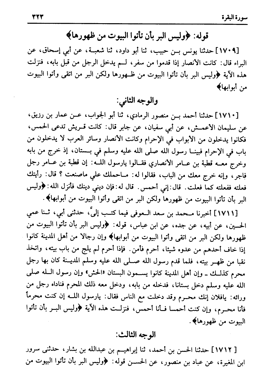 1712 - حَدَّثَنَا الْحَسَنُ بْنُ أَحْمَدَ، ثنا إِبْرَاهِيمُ بْنُ عَبْدِ اللَّهِ بْنِ بَشَّارٍ، حَدَّثَنِي سُرُورُ ابن الْمُغِيرَةِ، عَنْ عَبَّادِ بْنِ مَنْصُورٍ، عَنِ الْحَسَنِ قَوْلُهُ: وَلَيْسَ الْبِرُّ بِأَنْ تَأْتُوا الْبُيُوتَ مِنْ