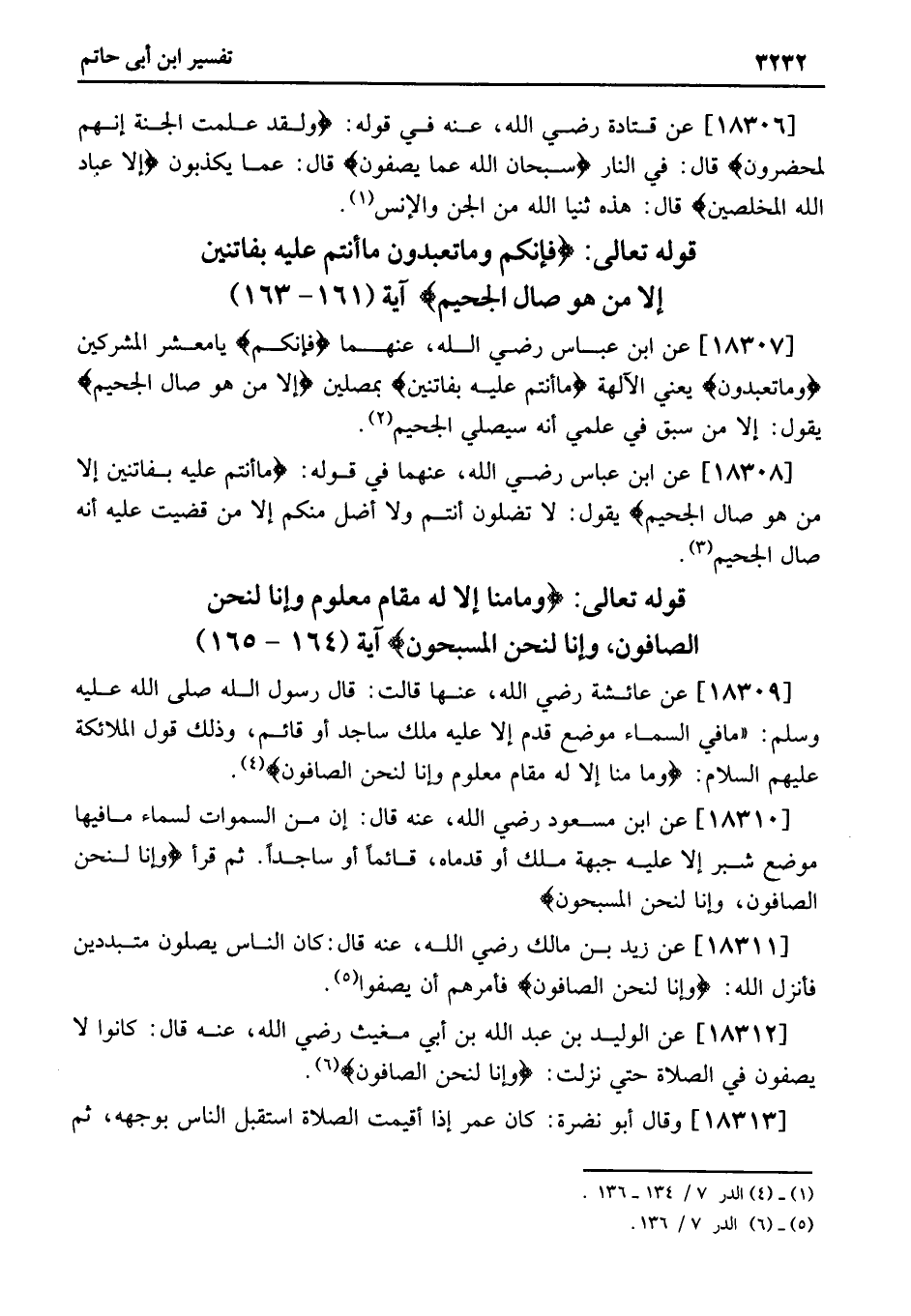 18310 - عَنِ ابْنِ مَسْعُودٍ رَضِيَ اللَّهُ، عَنْهُ قَالَ: إِنَّ من السموات لَسَمَاءٌ مَا فِيهَا مَوْضِعُ شِبْرٍ إِلا عَلَيْهِ جَبْهَةٌ مَلَكٍ أَوْ قَدَمَاهُ، قَائِمًا أَوْ سَاجِدًا. ثُمَّ قَرَأَ وَإِنَّا لَنَحْنُ الصَّافُّونَ، وَإِنَّا لَنَحْنُ الْمُسَبِّحُونَ