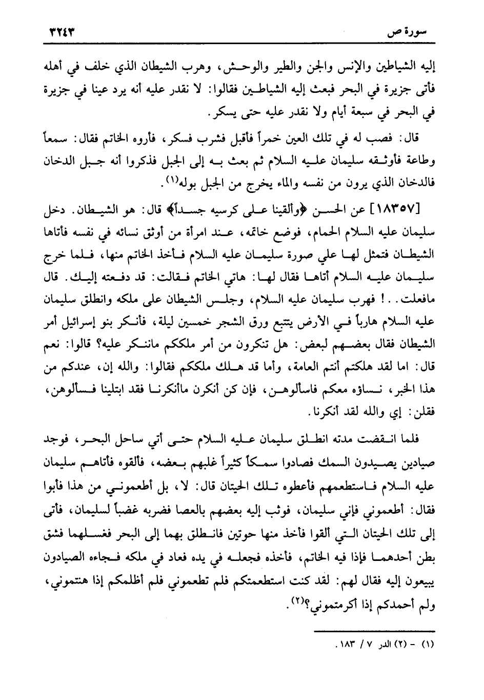 18357 - عَنِ الْحَسَنِ وَأَلْقَيْنَا عَلَى كُرْسِيِّهِ جَسَدًا قَالَ: هُوَ الشَّيْطَانُ. دَخَلَ سُلَيْمَانُ عَلَيْهِ السَّلامُ الْحَمَّامَ، فَوَضَعَ خَاتَمَهُ، عِنْدَ امْرَأَةٍ مِنْ أَوْثَقِ نِسَائِهِ فِي نَفْسِهِ فَأَتَاهَا الشَّيْطَانُ فَتَمَثَّلَ لَهَا عَلَى صُورَةِ سُلَيْمَانَ عَلَيْهِ السَّلامُ فَأَخَذَ الْخَاتَمَ مِنْهَا، فَلَمَّا خَرَجَ سُلَيْمَانُ عَلَيْهِ السَّلامُ أَتَاهَا فَقَالَ لَهَا: هَاتِي الْخَاتَمُ فَقَالَتْ: قَدْ دَفَعْتُهُ إليك. قَالَ مَا فَعَلْتِ..! فَهَرَبَ سُلَيْمَانُ عَلَيْهِ السَّلامُ، وَجَلَسَ الشَّيْطَانُ عَلَى مُلْكِهِ وَانْطَلَقَ سُلَيْمَانُ عَلَيْهِ السَّلامُ هَارِبًا فِي الْأَرْضِ يَتَتَبَّعُ وَرَقَ الشَّجَرِ خَمْسِينَ لَيْلَةً، فَأَنْكَرَ بَنُو إِسْرَائِيلَ أَمْرَ الشَّيْطَانِ فَقَالَ بَعْضُهُمْ لِبَعْضٍ: هَلْ تُنْكِرُونَ مَنْ أَمَرِ مَلِكِكُمْ مَا نُنْكِرُ عَلَيْهِ؟ قَالُوا: نَعَمْ قَالَ: أَمَّا لَقَدْ هَلَكْتُمْ أَنْتُمُ الْعَامَّةُ، وَأَمَّا قَدْ هَلَكَ مَلِكُكُمْ فَقَالُوا: وَاللَّهِ إِنَّ، عِنْدَكُمْ مِنْ هَذَا الْخَبَرِ، نِسَاؤُهُ مَعَكُمْ فَاسْأَلُوهُنَّ، فَإِنْ كُنَّ أَنْكَرْنَ مَا أَنْكَرْنَا فَقَدِ ابْتُلِينَا فَسَأَلُوهُنَّ، فَقُلْنَ: إِي وَاللَّهِ لَقَدْ أَنْكَرْنَا.