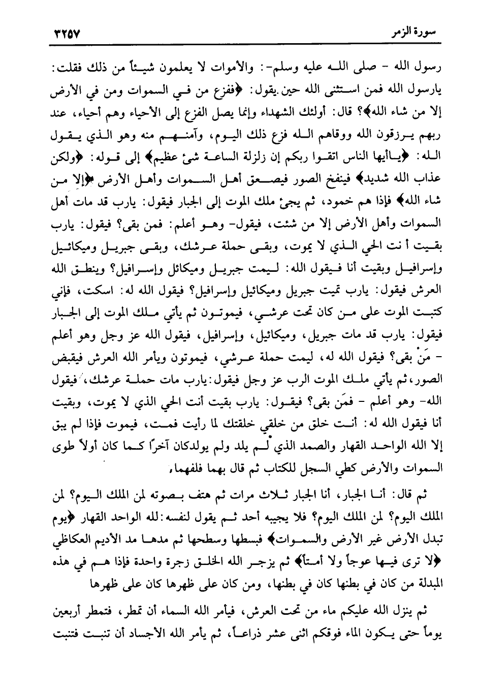 فَيُنْفَخُ الصُّورُ فَيُصْعَقُ أَهْلُ السَّمَوَاتِ وَأَهْلُ الْأَرْضِ إِلا مَنْ شَاءَ اللَّهُ فَإِذَا هُمْ خُمُودٌ، ثُمَّ يَجِئُ مَلَكُ الْمَوْتِ إِلَى الْجَبَّارِ فَيَقُولُ: يَا رَبِّ قَدْ مَاتَ أَهْلُ السموات وَأَهْلُ الْأَرْضِ إِلا مَنْ شِئْتَ، فَيَقُولُ- وَهُوَ أعلم: فمن بَقِيَ؟ فَيَقُولُ: يَا رَبِّ بَقِيتَ أَنْتَ الْحَيُّ الَّذِي لَا يَمُوتُ، وَبَقِيَ حَمَلَةُ عَرْشِكَ، وَبَقِيَ جِبْرِيلُ وَمِيكَائِيلُ وَإِسْرَافِيلُ وَبَقِيتُ أَنَا فَيَقُولُ اللَّهُ: لِيَمُتْ جِبْرِيلُ وَمِيكَائِيلُ وَإِسْرَافِيلُ؟ وَيُنْطِقُ اللَّهُ الْعَرْشَ فَيَقُولُ: يَا رَبِّ تُمِيتُ جِبْرِيلَ وَمِيكَائِيلَ وَإِسْرَافِيلَ؟ فَيَقُولُ اللَّهُ لَهُ: اسْكُتْ، فَإِنِّي كَتَبْتُ الْمَوْتَ عَلَى مَنْ كَانَ تَحْتَ عَرْشِي، فَيَمُوتُونَ ثُمَّ يَأْتِي مَلَكُ الْمَوْتِ إِلَى الْجَبَّارِ فَيَقُولُ: يَا رَبِّ قَدْ مَاتَ جِبْرِيلُ، وَمِيكَائِيلُ، وَإِسْرَافِيلُ، فَيَقُولُ اللَّهُ عَزَّ وَجَلَّ وَهُوَ أَعْلَمُ- من بقي؟ فَيَقَولَ اللَّهُ لَهُ، لِيَمُتْ حَمَلَةُ عَرْشِي، فَيَمُوتُونَ وَيَأْمُرُ اللَّهُ الْعَرْشَ فَيَقْبِضُ الصُّورَ، ثُمَّ يَأْتِي مَلَكُ الْمَوْتِ الرَّبَّ عَزَّ وَجَلَّ فَيَقُولُ: يَا رَبِّ مَاتَ حَمَلَةُ عَرْشِكَ، فَيَقُولُ اللَّهُ- وَهُوَ أعلم- فمن بَقِيَ؟ فَيَقُولُ: يَا رَبِّ بَقِيتَ أَنْتَ الْحَيُّ الَّذِي لَا يَمُوتُ، وَبَقِيتُ أَنَا فَيَقُولُ اللَّهُ لَهُ: أَنْتَ خَلْقٌ مِنْ خَلْقِي خَلَقْتُكَ لِمَا رَأَيْتَ فَمُتْ، فَيَمُوتُ فَإِذَا لَمْ يَبْقَ إِلا اللَّهُ الْوَاحِدُ الْقَهَّارُ وَالصَّمَدُ الَّذِي لَمْ يَلِدْ وَلَمْ يُولَدْ كَانَ آخَرًا كَمَا كان أولا طوى السموات وَالْأَرْضَ كَطَيِّ السِّجِلِ لِلْكِتَابِ ثُمَّ قَالَ بِهِمَا فَلَفَّهُمَا.