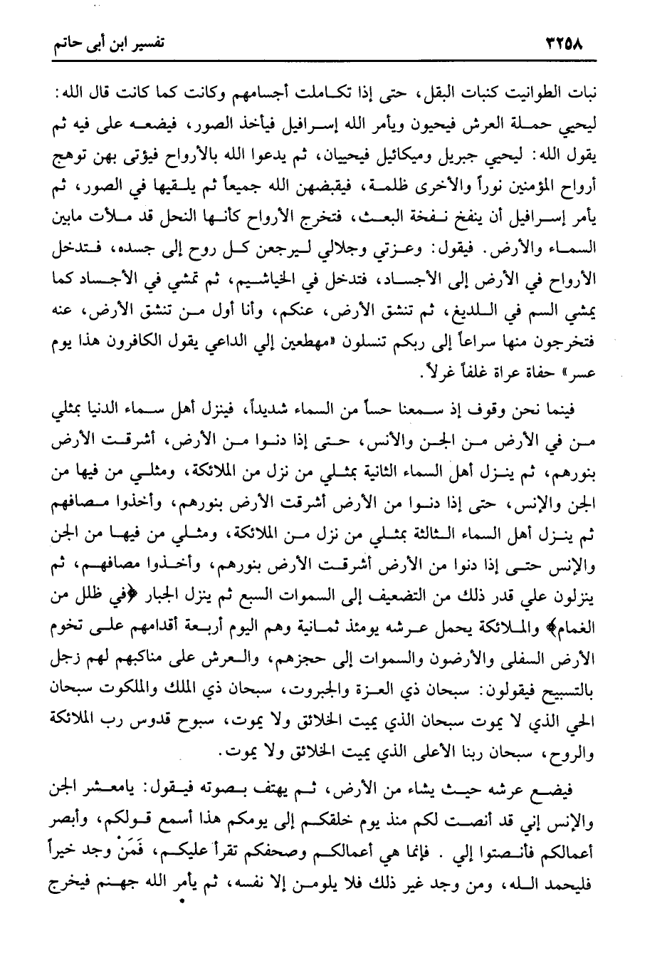 فبينما نَحْنُ وُقُوفٌ إِذْ سَمِعْنَا حَسًّا مِنَ السَّمَاءِ شَدِيدًا، فَيَنْزِلُ أَهْلُ سَمَاءِ الدُّنْيَا بِمِثْلَيْ مَنْ فِي الْأَرْضِ مِنَ الْجِنِّ وَالْإِنْسِ، حَتَّى إِذَا دَنَوْا مِنَ الْأَرْضِ، أَشْرَقَتِ الْأَرْضُ بِنُورِهِمْ، ثُمَّ يَنْزِلُ أَهْلُ السَّمَاءِ الثَّانِيَةِ بِمِثْلِيْ مَنْ نَزَلَ مِنَ الْمَلائِكَةِ، وَمِثْلِيْ مَنْ فِيهَا مِنَ الْجِنِّ وَالْإِنْسِ، حَتَّى إِذَا دَنَوْا مِنَ الْأَرْضِ أَشْرَقَتِ الْأَرْضُ بِنُورِهِمْ، وَأَخَذُوا مَصَافَّهُمْ ثُمَّ يَنْزِلُ أَهْلُ السَّمَاءِ الثَّالِثَةِ بِمِثْلِيْ مَنْ نَزَلَ مِنَ الْمَلائِكَةِ، وَمِثْلِيْ مَنْ فِيهَا مِنَ الْجِنِّ وَالْإِنْسِ حَتَّى إِذَا دَنَوْا مِنَ الْأَرْضِ أَشْرَقَتِ الْأَرْضُ بِنُورِهِمْ، وَأَخَذُوا مَصَافَّهُمْ، ثُمَّ يَنْزِلُونَ عَلَى قَدْرِ ذَلِكَ من التضعيف إلى السموات السَّبْعِ ثُمَّ يَنْزِلُ الْجَبَّارُ فِي ظُلَلٍ مِنَ الْغَمَامِ وَالْمَلائِكَةُ يَحْمِلُ عَرْشَهُ يَوْمَئِذٍ ثَمَانِيَةٌ وَهُمُ الْيَوْمَ أَرْبَعَةٌ أَقْدَامُهُمْ عَلَى تُخُومِ الْأَرْضِ السُّفْلَى والأرضون والسموات إِلَى حَجْزِهِمْ، وَالْعَرْشُ عَلَى مَنَاكِبِهِمْ لَهُمْ زَجْلٌ بِالتَّسْبِيحِ فَيَقُولُونَ: سُبْحَانَ ذِي الْعِزَّةِ وَالْجَبَرُوتِ، سُبْحَانَ ذي الملك والملكوت سبحان الحي الذي لا يموت سبحان الَّذِي يُمِيتُ الْخَلائِقَ وَلا يَمُوتُ، سَبُوحٌ قُدُّوسٌ رَبُّ الْمَلائِكَةِ وَالرُّوحِ، سُبْحَانَ رَبِّنَا الْأَعْلَى الَّذِي يُمِيتُ الْخَلائِقَ وَلا يَمُوتُ.
