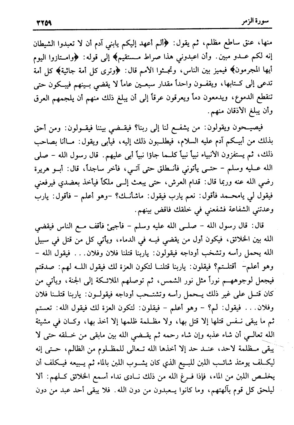 قَالَ: قَالَ رَسُولُ اللَّهِ- صَلَّى اللَّهُ عَلَيْهِ وَسَلَّمَ- فأجيء فَأَقِفُ مَعَ النَّاسِ فَيَقْضِي اللَّهُ بَيْنَ الْخَلائِقِ، فَيَكُونُ أَوَّلُ مَنْ يَقْضِي فِيهِ فِي الدِّمَاءِ، وَيَأْتِي كُلُّ مَنْ قُتِلَ فِي سَبِيلِ اللَّهِ يَحْمِلُ رَأْسَهُ وَتَشْخُبُ أَوْدَاجُهُ فَيَقُولُونَ: يَا رَبَّنَا قَتَلَنَا فُلانٌ وَفُلانٌ ... فَيَقُولُ اللَّهُ- وَهُوَ أَعْلَمُ- أَقُتِلْتُمْ؟ فَيَقُولُونَ: يَا رَبَّنَا قُتِلْنَا لِتَكُونَ الْعِزَّةُ لَكَ فَيَقُولُ اللَّهُ لَهُمْ: صَدَقْتُمْ فَيَجْعَلُ لِوُجُوهِهِمْ نُورًا مِثْلَ نُورِ الشَّمْسِ، ثُمَّ تُوَصِّلُهُمُ الْمَلائِكَةُ إِلَى الْجَنَّةِ، وَيَأْتِي مَنْ كَانَ قُتِلَ عَلَى غَيْرِ ذَلِكَ يحمل رأسه وتشتخب أَوْدَاجُهُ فَيَقُولُونَ: يَا رَبَّنَا قَتَلَنَا فُلانٌ وَفُلانٌ ... فيقول: لم؟ - وهو أعلم- فيلقون: لِتَكُونَ الْعِزَّةُ لَكَ فَيَقُولُ اللَّهُ: تَعِسْتُمْ ثُمَّ مَا يَبْقَى نَفْسٌ قَتَلَهَا إِلا قُتِلَ بِهَا، وَلا مَظْلَمَةٌ ظَلَمَهَا إِلا أَخُذِ بِهَا، وَكَانَ فِي مَشِيئَةِ اللَّهِ تَعَالَى إِنْ شَاءَ عَذَّبَهُ وَإِنْ شَاءَ رَحِمَهُ ثُمَّ يَقْضِي اللَّهُ بَيْنَ مَا بَقِيَ مِنْ خَلْقِهِ حَتَّى لَا يَبْقَى مَظْلَمَةٌ لِأَحَدٍ، عِنْدَ أَحَدٍ إِلا أَخَذَهَا اللَّهُ تَعَالَى لِلْمَظْلُومِ مِنَ الظَّالِمِ، حَتَّى إِنَّهُ لَيُكَلِّفُ يَوْمَئِذٍ شَائِبَ اللَّبَنِ لِلْبَيْعِ الَّذِي كَانَ يَشُوبُ اللَّبَنَ بِالْمَاءِ ثُمَّ يَبِيعُهُ فَيُكَلَّفُ أَنْ يُخَلِّصَ اللَّبَنَ مِنَ الْمَاءِ، فَإِذَا فَرَغَ اللَّهُ مِنْ ذَلِكَ نَادَى نِدَاءً أَسْمَعَ الْخَلِائِقَ كُلَّهُمْ: أَلا لِيَلْحَقْ كُلُّ قَوْمٍ بِآلِهَتِهِمْ، وَمَا كَانُوا يَعْبُدُونَ مِنْ دُونِ اللَّهِ. فَلا يَبْقَى أَحَدٌ عَبَدَ من دون
