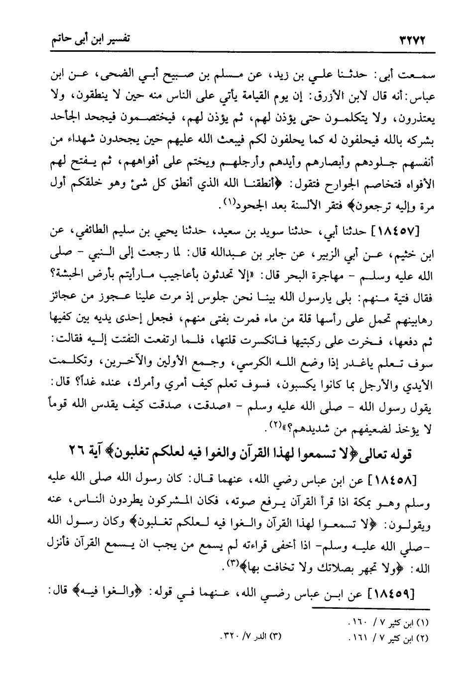 سَمِعْتُ أَبِي: حَدَّثَنَا عَلِيُّ بْنُ زَيْدٍ، عَنْ مُسْلِمِ بْنِ صُبَيْحٍ أَبِي الضُّحَى، عَنِ ابْنِ عَبَّاسٍ: أَنَّهُ قَالَ لِابْنِ الْأَزْرَقِ: إِنَّ يَوْمَ الْقِيَامَةِ يَأْتِي عَلَى النَّاسِ مِنْهُ حِينَ لَا يَنْطِقُونَ، وَلا يَعْتَذِرُونَ، وَلا يَتَكَلَّمُونَ حَتَّى يُؤْذَنَ لَهُمْ، ثُمَّ يُؤْذَنُ لَهُمْ، فَيَخْتَصَمُونَ فَيَجْحَدُ الْجَاحِدُ بِشِرْكِهِ بِاللَّهِ فَيَحْلِفُونَ لَهُ كَمَا يَحْلِفُونَ لَكُمْ فَيَبْعَثُ اللَّهُ عَلَيْهِمْ حِينَ يَجْحَدُونَ شُهَدَاءَ مِنْ أنفسهم جلودهم وأبصارهم وأيدهم وَأَرْجُلَهُمْ وَيَخْتِمُ عَلَى أَفْوَاهِهِمْ، ثُمَّ يَفْتَحُ لَهُمُ الأفواه فتخاصم الجوارح فتقول: أنطقنا الله الذي أَنطَقَ كُلَّ شَيْءٍ وَهُوَ خَلَقَكُمْ أَوَّلَ مَرَّةٍ وَإِلَيْهِ تُرْجَعُونَ فَتُقِرُّ الْأَلْسِنَةُ بَعْدَ الْجُحُودِ «1» .