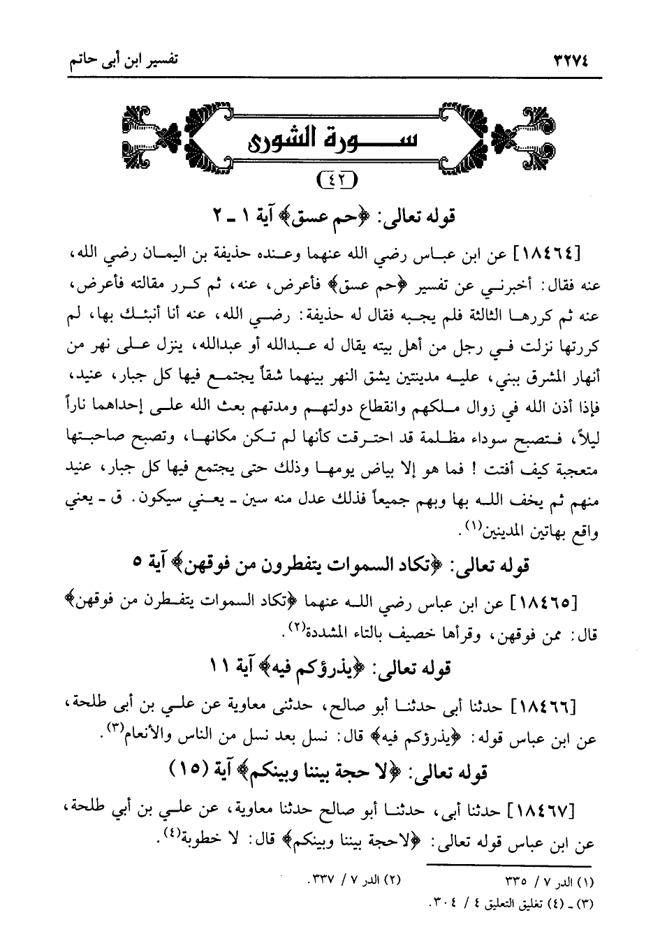18464 - عَنِ ابْنِ عَبَّاسٍ رَضِيَ اللَّهُ عَنْهُمَا وَعِنْدَهُ حُذَيْفَةُ بْنُ الْيَمَانِ رَضِيَ اللَّهُ، عَنْهُ فَقَالَ: أَخْبِرْنِي عَنْ تَفْسِيرِ حم عسق فَأَعْرَضَ، عَنْهُ، ثُمَّ كَرَّرَ مَقَالَتَهُ فَأَعْرَضَ، عَنْهُ ثُمَّ كَرَّرَهَا الثَّالِثَةَ فَلَمْ يُجِبْهُ فَقَالَ لَهُ حُذَيْفَةُ: رضِيَ اللَّهُ، عَنْهُ أَنَا أُنَبِّئُكَ بِهَا، لم كَرَّرْتَهَا نَزَلَتْ فِي رَجُلٍ مِنْ أَهْلِ بَيْتِهِ يقال له عبد الله أو عبد اللَّهِ، يَنْزَلُ عَلَى نَهْرٍ مِنْ أَنْهَارِ الْمَشْرِقِ بِبَنِي، عَلَيْهِ مَدَيْنَتَيْنِ يُشَقُّ النَّهْرُ بَيْنَهُمَا شَقًّا يَجْتَمِعُ فِيهَا كُلُّ جَبَّارٍ، عَنِيدٍ، فَإِذَا أَذِنَ اللَّهُ فِي زَوَالِ مُلْكِهِمْ وَانْقِطَاعِ دَوْلَتِهِمْ وَمُدَّتِهِمْ بَعَثَ اللَّهُ عَلَى إِحْدَاهُمَا نَارًا لَيْلًا، فَتُصْبِحُ سَوْدَاءَ مُظْلِمَةً قَدِ احْتَرَقَتْ كَأَنَّهَا لَمْ تَكُنْ مكانها، وتصبح صاحبتها متعجبة كيف أفتت! فَمَا هُوَ إِلا بَيَاضُ يَوْمِهَا وَذَلِكَ حَتَّى يَجْتَمِعَ فِيهَا كُلُّ جَبَّارٍ، عَنِيدٍ مِنْهُمْ ثُمَّ يُخْفِ اللَّهُ بِهَا وَبِهِمْ جميعًا فَذَلِكَ عَدْلٌ منه سين- يعني سيكون. ق- يعني واقع بهاتين المدينين «1» .